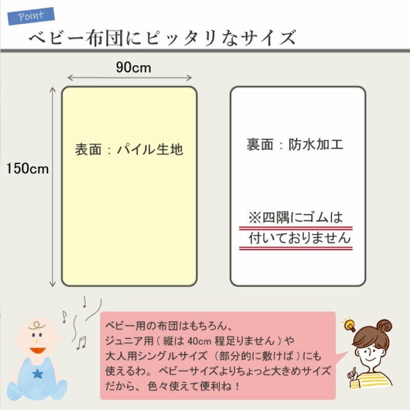 ★こちらの商品は、裏面四隅にゴムはついておりません★ ベビーの敷き布団をおねしょや寝汗から守る防水敷きパッド。 こんな経験ございませんか? ・子供がおねしょをしてしまい、敷き布団までビッショリ。。。 ・ペットがお布団に粗相をしてしまった。。。 ・寝汗でお布団がビッショリ。。。 そんな時は、防水シーツがオススメです!! 敷き布団の上に敷くだけでOK!! ・・・・・・・・・・・・・・・・・・・・ ●しっかり防水 しっかり防水!!水分を通しません。 ●表面はパイル生地 表地はやさしい肌触りのパイル素材です。 ●ご自宅でお洗濯可能! 推奨は手洗いですが、洗濯機でお洗濯も可能です! [お洗濯時のご注意] ・洗濯ネットをご使用ください。 ・他のお洗濯ものと一緒に脱水をしないでください。 ・脱水は、できるだけ短時間で脱水をお願いします。 ・より長持ちさせるために、日陰干しをお願いします。 ●用途はいろいろ ・おねしょ対策 ・ペットの粗相 ・寝汗対策 ・介護時の汚れ防止用 他にも、アウトドアや車のシートの汚れ防止など、様々なシーンで大活躍です!! ●品質検査済 第三者機関での公的品質試験実施済み! ・[ホルマリン検査] 低ホルムアルデヒド 基準値0.05を大きく下回る0.00と極めて低い値で 合格基準値をクリア!! ☆小さなお子様にも安心してご使用いただけます。 ・[耐水度] 耐水度 防水性に優れているので、お布団を濡らしません! ●安心の日本製 生地の裁断から縫製、仕上げ、 検品・パッケージまで 全て国内工場で生産いたしておりますので 安定した品質の商品をご提供できます。 ●こちらの商品は、四隅にゴムはついておりません。 部分用としてもお使いやすいサイズです。 ●コメント このビックサイズなら、ベビー用の布団は勿論、 ジュニア用(縦は40cm程足りません)や、大人用シングルサイズ(部分的に敷けば)にもお使い頂けるので、 ママと一緒におねんねベビーにもおすすめです。 ミルクの吐きこぼしなどからもお布団を守ります。 ・・・・・・・・・・・・・・・・・・・・ ●商品情報 ・サイズ:横90×縦150cm(四隅ゴムなし) ・カラー:ピンク・サックス・クリーム ・素材:[表面]パイル生地(綿80%・ポリエステル20%) [裏面]ポリウレタン100%(防水加工) ・生産国: 日本(天草)★こちらの商品は、裏面四隅にゴムはついておりません★ ベビーの敷き布団をおねしょや寝汗から守る防水敷きパッド。 こんな経験ございませんか? ・子供がおねしょをしてしまい、敷き布団までビッショリ。。。 ・ペットがお布団に粗相をしてしまった。。。 ・寝汗でお布団がビッショリ。。。 そんな時は、防水シーツがオススメです!! 敷き布団の上に敷くだけでOK!! ・・・・・・・・・・・・・・・・・・・・ ●しっかり防水 しっかり防水!!水分を通しません。 ●表面はパイル生地 表地はやさしい肌触りのパイル素材です。 ●ご自宅でお洗濯可能! 推奨は手洗いですが、洗濯機でお洗濯も可能です! [お洗濯時のご注意] ・洗濯ネットをご使用ください。 ・他のお洗濯ものと一緒に脱水をしないでください。 ・脱水は、できるだけ短時間で脱水をお願いします。 ・より長持ちさせるために、日陰干しをお願いします。 ●用途はいろいろ ・おねしょ対策 ・ペットの粗相 ・寝汗対策 ・介護時の汚れ防止用 他にも、アウトドアや車のシートの汚れ防止など、様々なシーンで大活躍です!! ●品質検査済 第三者機関での公的品質試験実施済み! ・[ホルマリン検査] 低ホルムアルデヒド 基準値0.05を大きく下回る0.00と極めて低い値で 合格基準値をクリア!! ☆小さなお子様にも安心してご使用いただけます。 ・[耐水度] 耐水度 防水性に優れているので、お布団を濡らしません! ●安心の日本製 生地の裁断から縫製、仕上げ、 検品・パッケージまで 全て国内工場で生産いたしておりますので 安定した品質の商品をご提供できます。 ●こちらの商品は、四隅にゴムはついておりません。 部分用としてもお使いやすいサイズです。 ●コメント このビックサイズなら、ベビー用の布団は勿論、 ジュニア用(縦は40cm程足りません)や、大人用シングルサイズ(部分的に敷けば)にもお使い頂けるので、 ママと一緒におねんねベビーにもおすすめです。 ミルクの吐きこぼしなどからもお布団を守ります。 ・・・・・・・・・・・・・・・・・・・・ ●商品情報 ・サイズ:横90×縦150cm(四隅ゴムなし) ・カラー:ピンク・サックス・クリーム ・素材:[表面]パイル生地(綿80%・ポリエステル20%) [裏面]ポリウレタン100%(防水加工) ・生産国: 日本(天草) ●カラーイメージ違いについて ご覧頂いている商品の写真につきましては、できるだけ実物の色に近くなるように努めておりますがお使いの環境(モニター、ブラウザ等)の違いにより、色の見え方が実物と若干異なる場合がございます。 予めご了承ください。