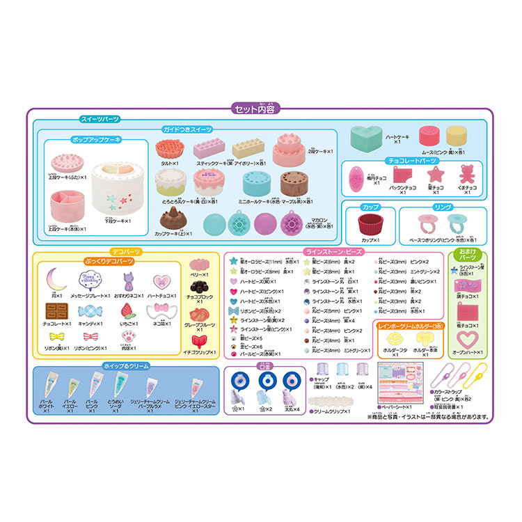 商品名ハッピーポップスイーツDX サイズW420×D109×H267mm 品 番W-160 メーカーエポック社 商品説明ホイップるクリームをしぼって、かわいいスイーツ作品をつくっちゃお! ●クリームたっぷり!ボリューム満点の超豪華、全部入りのスペシャルなセットです。 ●ジェリーチャームクリーム、パールクリーム、とうめいクリームが全部しぼれます。3色のレインボーカラーも! ●大きな2段ケーキはくるくる回して楽しい!ポップアップするステーショナリーケースになります。 ●マーブルカラーのスイーツやぷっくりデコパーツで、スタンダードなスイーツからポップでキラキラなスイーツ、アクセサリーがつくれます。 ●上手にしぼれる「パティシエガイドつきスイーツ」入り。 ・作れる数…20個 ・アクセサリーになる数…8個 ■セット内容■ ・ホイップるクリーム×6(パールホワイトクリーム、パールピンククリーム、パールイエロークリーム、とうめいソーダクリーム、ジェリーチャームクリーム・パープルラメ、ジェリーチャームクリーム・ピンクイエロースター) ・口金3種(☆10、☆18、太丸) ・スイーツパーツ×20種(パティシエガイドつきスイーツを含む) ・クリームクリップ ・カラーストラップ×6 対象年齢:8歳以上 (c) EPOCH 補 足【おもちゃ】【ホイップる】【セット商品】【対象年齢8歳以上】【202409】【色:ブルー】【色:ピンク】