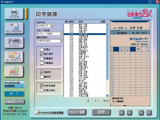 【商品説明】●簡単に印字イメージが確認できます。●個人番号、氏名所属コード、所属、年月、備考の設定が可能●200人×100グループ最大20000人の登録が可能●データ入力→選択→印字の簡単操作【仕様】●CSVファイルの読込みが可能 ●印字項目:個人番号・氏名・グループ情報・所属名・処理年・処理月・備考・予備情報 ●対応OS:Windows 7(32/64bit)/Vista/XP(SP2以降)/2000(SP4以降)●対応消耗品:タイムカードA〜Dカード、MRX専用タイムカード、Time P@CKカードA〜C、Pro P@CKカードA〜C、MXカード※ご購入前に必ずご使用になるプリンタでタイムカードの試し印刷を行い、印刷可能かどうかのご確認をお願いいたします。【検索用キーワード】AMANO タイムカードナマエソフト2 X18188パソコンの画面でタイムカードに名前書き!インクジェットプリンターで印刷可能!