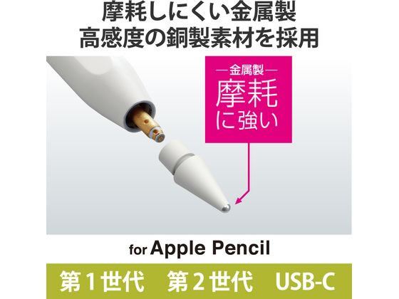 【商品説明】●摩耗しにくい金属製で、ApplePencilに近い形状の交換用ペン先です。●ペン先は摩耗しにくい高感度の銅製素材を採用しています。●ApplePencil(第1世代)、(第2世代)、(USB−C)に使用可能です。●2個入りです。●※本製品はApplePencil専用です。●※iPadの液晶画面を傷付ける恐れがあるため、必ず液晶保護フィルムを貼ってご使用ください。【仕様】●対応機種:ApplePencil(第1世代)、ApplePencil(第2世代)、ApplePencil(USB−C)●外形寸法:ペン先:約1.8mm●材質:本体:ポリアセタール、ペン先:銅●セット内容:交換ペン先:2個、取扱説明書【備考】※メーカーの都合により、パッケージ・仕様等は予告なく変更になる場合がございます。【検索用キーワード】エレコム ELECOM えれこむ P−TIPAP03 タッチペン ペン先 交換 交換用 交換用ペン先 替え芯 Apple Pencil ApplePencil アップルペンシル PTIPAP03 電話 FAX スマートフォン・携帯電話関連品 スマートフォン・携帯電話関連品 X516MW純正のApple Pencilに近い形状で、摩耗しにくい金属製のApple Pencil交換用ペン先。