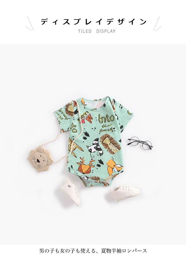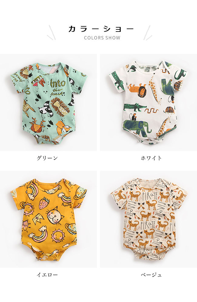【送料無料】ベビー服 夏 ロンパース ユニセックス 赤ちゃん カバーオール 男児 女児 Tシャツ 半袖 アニマル柄 涼しい コットン 可愛い 半袖ロンパース ベビー 半袖Tシャツ お洒落 クルーネック サマーロンパース グリーン ホワイト イエロー