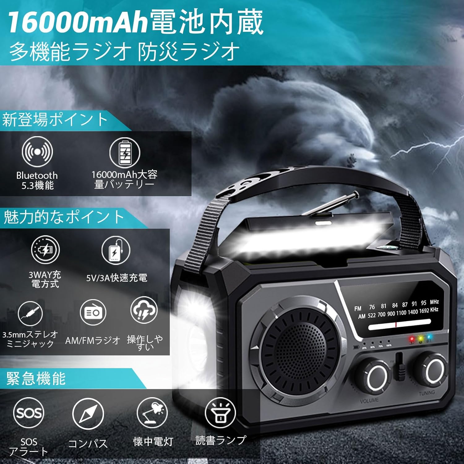 防災ラジオ モバイルバッテリー 大容量 防災 ラジオ 多機能 ポータブルラジオ 大音量AM/SW/FMラジオ ワイドFM対応 LEDライト スマホ充電 SOS スピーカー 乾電池 ソーラー充電 手回し充電 USB充電 16000mAh搭載 軽量 コンパクト 防災グッズ 被災地 地震 台風 懐中電灯
