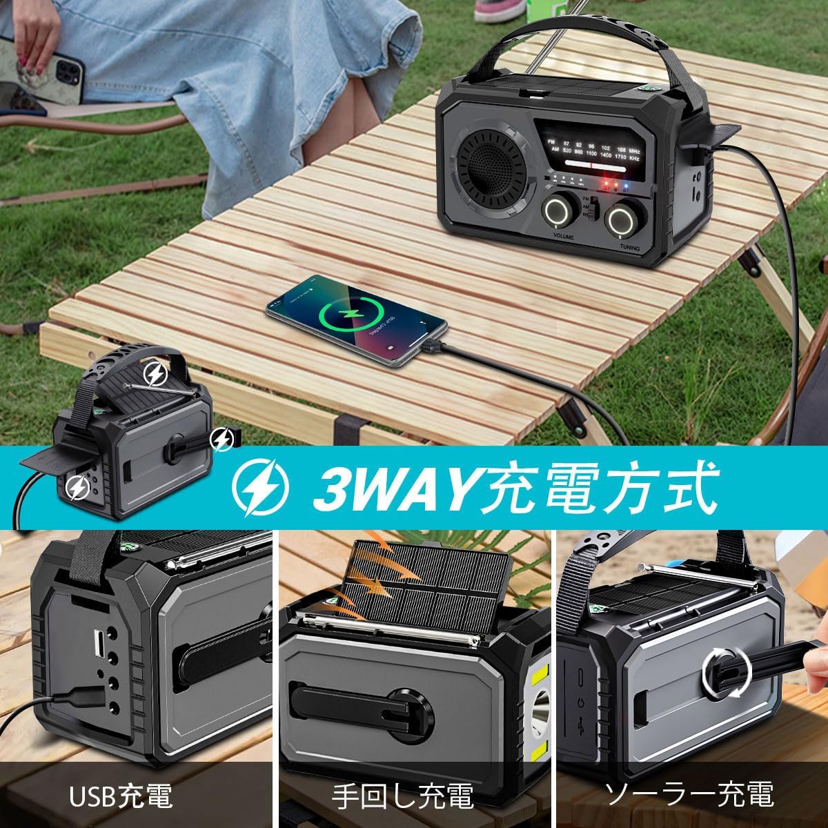 MagSafeアクセサリー Apple Watch対応商品はこちら 【高感度受信 & Bluetooth 5.3対応の多機能ラジオ】 本商品はAM(522〜1629kHz)とFM(76〜95MHz)の受信に対応しており、簡単な操作で放送局を選局できます。電源・音量ダイヤルを右に回して電源を入れ、選局ダイヤルで周波数を調整。AM/FM切替スイッチでモードを変更可能です。受信周波数は目盛り表示で一目で確認でき、直感的に操作できます。360度回転するアンテナを搭載し、優れた受信感度を実現。さらに、Bluetooth 5.3機能も備えており、音楽再生にも対応。3.5mmイヤホンジャック付きで、周囲が騒がしい場所でも快適にラジオを楽しめます。 【モバイルバッテリーとしても活躍・3通りの充電方式】 16000mAhの大容量バッテリーを内蔵しており、スマートフォンなどの機器に5V/3Aで急速充電が可能です。フル充電で最大約150時間のラジオ使用が可能なため、停電や災害時にも安心して使えます。懐中電灯モードは最大49時間、Bluetooth接続は約48時間、ラジオ+読書灯の同時使用時でも約23時間連続稼働します。充電方式はUSB充電・手回し発電・ソーラー充電の3通り。USBなら約4時間でフル充電が可能です。手回し充電では約40時間分、ソーラー充電では約91時間分の充電が可能です(環境条件による)。 【多彩な機能を搭載した防災ラジオ】 懐中電灯、読書灯、SOSサイレン、イヤホンジャック、コンパスなど、多機能を一台に集約。 ・懐中電灯はハイビーム/ロービーム/両方点灯の3モードを搭載し、夜間の移動や停電時に活躍。 ・90度に開閉できる読書灯は51個のLEDを内蔵し、広範囲を明るく照らします。 ・SOSサイレンは最大80dBの音を発し、万が一の際に自身の存在を知らせることが可能です。 ・3.5mmイヤホンジャック付きで、避難所などの公共空間でも周囲を気にせずラジオを聴くことができます。 ・内蔵のコンパスは、アウトドアや避難時の方位確認に役立ちます。 【携帯に便利なコンパクト設計】 本体サイズは約15.6×8.3×9.9cm、重さ約732g。カバンに入れて持ち運べるサイズで、アウトドアや防災用としても便利です。マジックテープ付きのストラップが付属しており、持ち歩きやすく、荷物にも取り付け可能。自宅・外出先のどちらでも活用できます。 【電気用品安全法(PSE)に適合・スマート充電機能付き】 本商品は日本の電気用品安全法(PSE)に適合した設計で、過熱・過充電・温度保護などの安全機能を備えています。16000mAhのリチウムバッテリーはモバイルバッテリーとしても使用でき、各種スマートフォンに対応。出力電流は3Aで、一般的な2Aに比べて高速での充電が可能です。バッテリー残量は25%・50%・75%・100%の4段階で表示され、使用時のモードによって本体ランプの色が変わります。(赤色:USB出力時/オレンジ色:手回し・ソーラー充電時/青色:Bluetooth接続時) ※商品は入荷時期によりアップグレードによる仕様変更がある場合がございます。あらかじめご了承ください。 ※安価な酷似商品や転用画像商品にご注意ください。 ⇒ハンディファン/扇風機/サーキュレーター 一覧はコチラ ⇒冷風扇・冷風機 一覧はコチラ ⇒ヘッドレストモニター 一覧はコチラ ⇒車載用アクセサリー 一覧はコチラ ⇒充電器・チャージャー商品一覧はコチラ ⇒モバイルモニター商品一覧はコチラ ⇒プロジェクター商品一覧はコチラ ⇒Nintendo Switch関連商品一覧はコチラ ⇒ヘッドホン商品一覧はコチラ ⇒キッズスマートウォッチ 商品一覧はコチラ ⇒イヤホン商品一覧はコチラ ⇒apple watchバンド一覧はコチラ ⇒AirTag 一覧はコチラ ⇒タブレットPC本体 商品一覧はコチラ ⇒空気伝導イヤホン商品一覧はコチラ ⇒骨伝導イヤホン商品一覧はコチラ ⇒イヤホン商品一覧はコチラ ⇒ストラップ 商品一覧はコチラ ⇒Magsafe ACC商品一覧はコチラ ⇒USB加湿器 商品一覧はコチラ ⇒キッズタブレット 商品一覧はコチラ ⇒スマートウォッチ本体一覧はコチラ ⇒ストラップ 商品一覧はコチラ ⇒自転車/バイク用スマホホルダーはコチラ ⇒自撮り棒関連商品一覧はコチラ ⇒三脚商品一覧はコチラ ⇒スタビライザー一覧はコチラモバイルバッテリー 大容量 防災ラジオ 多機能 ポータブルラジオ 大音量AM/SW/FMラジオ ワイドFM対応 LEDライト スマホ充電 SOS スピーカー 乾電池 ソーラー充電 手回し充電 USB充電 16000mAh搭載 軽量 コンパクト 防災グッズ 被災地 地震 台風 懐中電灯 B0DNZBNS1S 父の日 母の日 敬老の日 クリスマス プレゼント 出産祝い 新築祝い 新生活 入学 卒業 誕生日プレゼント お中元 お歳暮ギフト jmei スマホケース 韓国 ラッピング 対応 バレンタインデー ホワイトデー 男の子 女の子 こどもの日 キャンプ アウトドア 海 登山 通勤 通学リモートワーク 在宅ワーク ペット 犬 猫 ドライブ オンラインゲーム ニンテンドースイッチ プレーステーション イベント 結婚式 お祭り パーティーグッズ 縁日 敬老の日プレゼント 敬老の日 プレゼント 孫 孫から ギフト 母の日 プレゼント 早割 入学祝い 小学校 女の子 卒業祝い プレゼント 中学