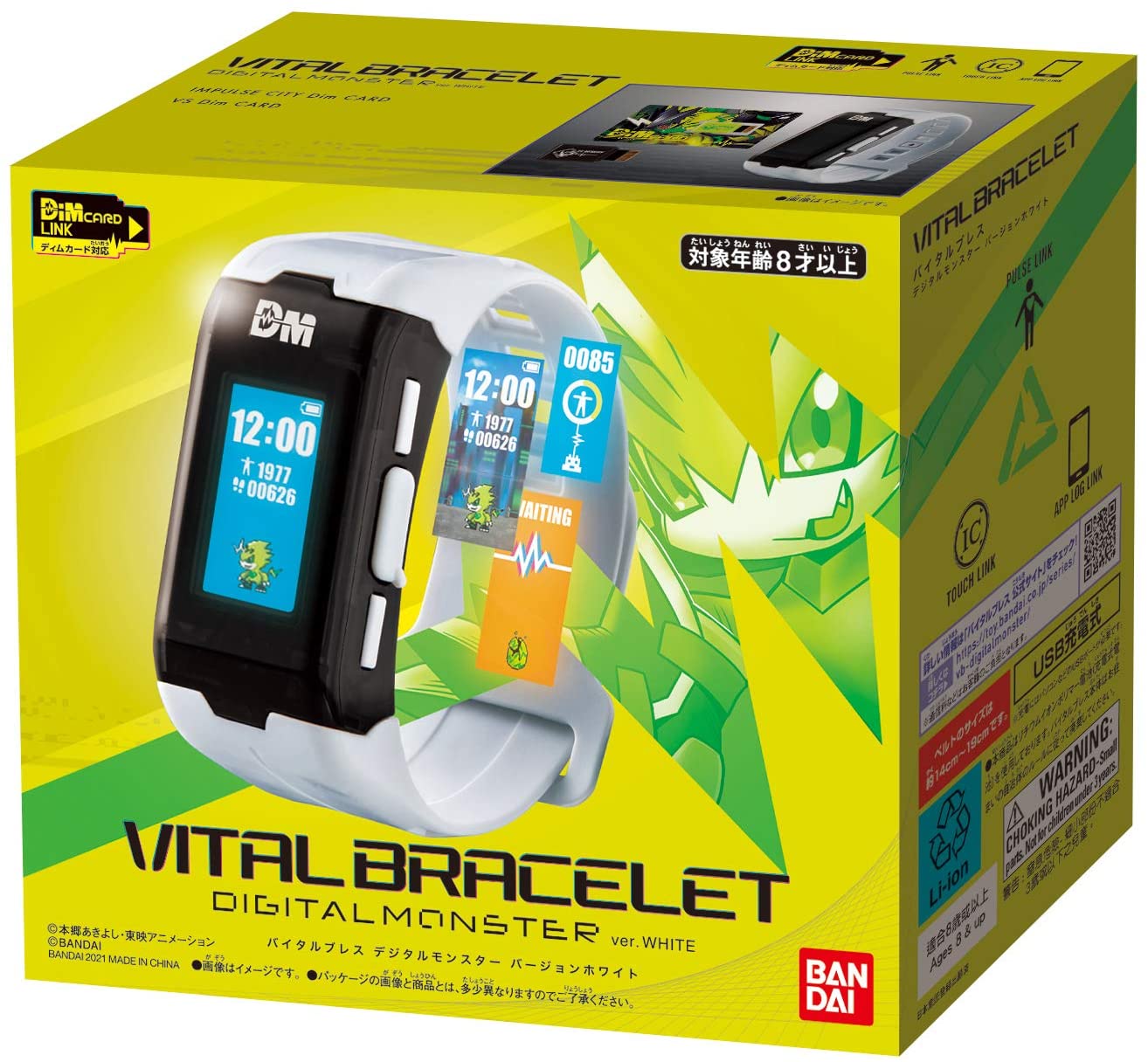 商品紹介 自分の心拍数や歩数といった活動量によって、キャラクターを育成・進化ができるウェアラブル液晶玩具シリーズ「バイタルブレス」 より 「デジタルモンスター ver.WHITE」が登場。 NFCチップを内蔵しており、アプリ等で、電波を発する状態にあるNFC搭載のスマートフォンや、街中のカードリーダー等のIC機器にタッチすることでデジモンたちのオートバトルが可能です。専用アプリを使えば、育てたデジモンの管理や図鑑登録、オンラインバトルも可能。 別売りのDimカードを挿入することで、エリアと育成デジモンを変更することもできます。 (本商品に付属するもの以外すべて別売りです。) [セット内容] ・バイタルブレス デジタルモンスター ver.WHITE・・・1 ・インパルスシティDimカード・・・1 ・VS Dimカード・・・1 ・充電ケーブル…1 ※早期購買特典:Dimカード(トライアル版) つきです。(数量無くなり次第終了となります。)