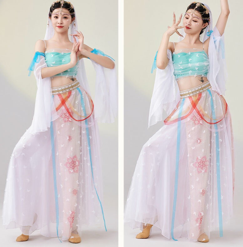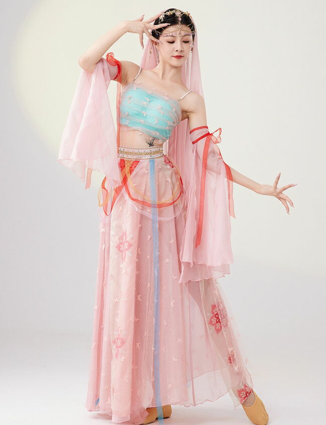 中華風 アラビアン 全身コスチューム レディース 中華古典ダンス 敦煌舞踊 チャイナ民族ダンス 衣装 キャミソール 姫袖 スカート ひらひら 飄逸 中国古代 飛天 天女 仙女 コスプレ衣装 中華 ハロウィン衣装 ベール 髪飾り 組合せ可 白 ピンク M L XL