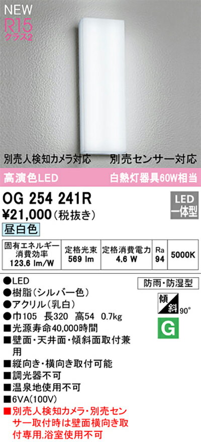 ●昼白色 ●固有エネルギー消費効率: 123.6lm/W ●定格光束: 569lm ●定格消費電力: 4.6W ●Ra94 ●5000K ●LED ●樹脂(シルバー色) ●アクリル(乳白) ●巾105、高320、出54、0.7kg ●光源寿命40,000時間 ●壁面・天井面・傾斜面取付兼用 ●縦向き・横向き取付可能 ●調光器不可 ●温泉地使用不可 ●6VA(100V) ●防雨・防湿型 ※別売人検知カメラ・別売センサー取付時は壁面横向き取付専用 ※浴室使用不可 【メーカー名】オーデリック(株) 【メーカー品番】OG 254 241R