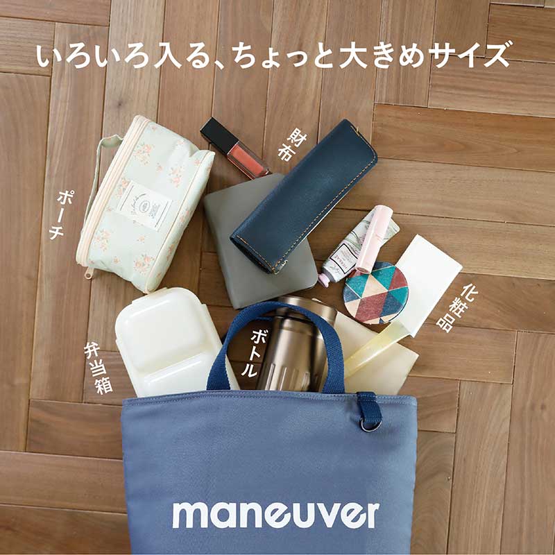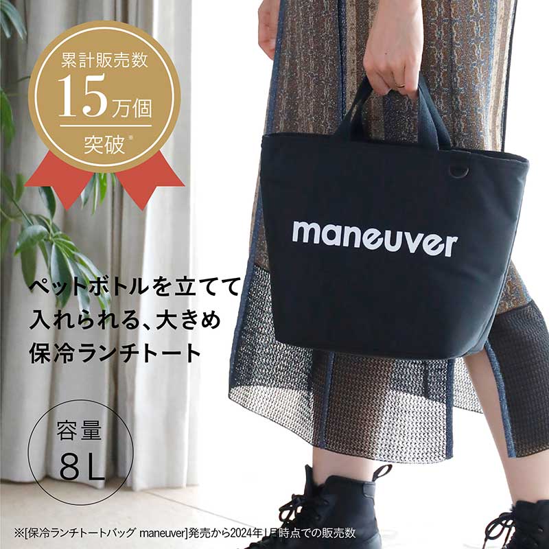 ●累計15万個販売のロングセラー商品「保冷ランチトートバッグ maneuver」がさらに可愛く、使いやすくなって再登場! ランチトートとしてだけでなく普段使いにも最適な、様々なシーンで使える大人気の保冷バッグ「maneuver シリーズ」のMサイズ。 お弁当や水筒以外にも、携帯電話や財布、ペンケースや化粧品など、お出かけグッズをまとめて一緒に持ち運べるのでマルチに使えます。 ●ちょっと大きいから色々入る お弁当や水筒以外にも、携帯電話や財布、ペンケースや化粧品など、お出かけグッズをまとめて一緒に持ち運べる便利なサイズ感のMサイズ。 ●内面はEVA生地を採用。保冷バッグ感がないのにしっかり保冷! 内側はEVA生地でしっかり保冷。保冷剤を入れるポケットも付いています。 しっかり保冷の4層レイヤーで暑い季節でも安心。 ●サイズ: (約)W340×D140×H250mm(持ち手部は除く) ●重量: (約)150g ●容量: 8L ●耐荷重(kg): 6kg ●材質: [外生地]ポリエステル、[中生地]EPE・不織布、[内生地]EVA樹脂 ●カラー: ブラック 【メーカー名】(株)シービージャパン 【メーカー品番】4573306871682