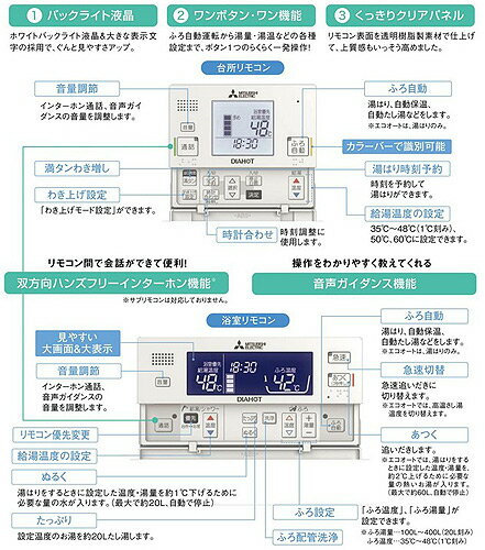※納期の目安として約3〜4か月程度掛かります。正式な納期は分かり次第ご連絡させて頂きます。 ※こちらの商品は配送時に必ず荷受人が必要となります。 また車上渡しとなります為、お客様のみでの荷下ろしが必須です。 上記ご確認の上、注文手続きにお進みください。 ※工事もご検討のお客様は基本当社施工店送りとなりますのでお荷受けは不要です。 一部対象外の地域がございます。詳しくはお見積りご依頼下さい。 【セット内容】 (1)SRT-J46WDM5 本体 (2)RMC-JD5SE インターホンタイプリモコンセット(浴室リモコン+台所リモコン) (3)GT-K550C 脚部カバー(460Lローボディ・550L用) ※設置工事費、部材費など、別途必要となります。 ※メーカー保証は2年間です。 【規格・特徴】 ・寸法(高さ×幅×奥行mm):1800×700×825 ・本体質量(満水時):81kg(541kg) ・タンク容量:460L ・わき上げヒーター容量:5.4kW ・最大消費電力:5.6kW ・ふろ保温時消費電力:140W ・凍結防止ヒーター:60W ・タンクわき上げ温度:約75度〜約90度 ・通常使用圧力/最高使用圧力:170kPa(減圧弁設定値)/193kPa(逃し弁設定値) ・高圧力型 ・フルオートダブル追いだき ・屋内屋外兼用 ・ローボディ ・タンク内への給水温度の変化や残湯量などをもとに、通電開始時刻をマイコン制御。 (この機種は、電力会社によって深夜電力料金からの割引が適用されます。詳しくは最寄の電力会社のご確認下さい。) ・エマスト(エマージェンシーストップ機能) ・自動湯はり ・自動保温 ・自動たし湯 ・高圧力型170kPa ・ツイン湯温コントロール ・サブリモコン対応(別売) ・耐震クラスA(タフレッグ) 【別売部材】 ・リモコンケーブル(20m) LM-620B ・リモコンケーブル(50m) LM-650B ・フルオート用浴槽アダプタ(ストレート) GT-F761B ・フルオート用浴槽アダプタ(L型) GT-F791B ・アンカーボルト(脚部固定用 30本入) GZ-B1F ・アース棒 GT-30F ・サブリモコン RMCB-KZ5 【商品説明】 リモコンワンタッチでお湯はり完了、そのままお好みの湯温と湯量を自動キープします。 設定時間後にお湯が冷めたら、ワンタッチで追いだきも!毎日いたれりつくせりの便利さです。 【メーカー直送便の注意事項】 下記の条件がございますので、商品によってはご準備くださいますようお願い致します。 ※別途金額が発生する場合がありますので必ずご一読ください。 ■商品お渡しについて 基本ドライバー1人で訪問の為、荷下ろしの際にお手伝いできる方が必要となります。 集合住宅の場合は1階及びエントランス、戸建住宅の場合は玄関先でのお引き渡しとなります。 ■配送車について 一般的な宅配業者でございません。メーカー指定の大型トラック(4t車)にての配送となります。 道幅6m(一般的な軽自動車がすれ違える道幅)以下の場合、配達ができません。 別途追加料金が発生いたしますが、2tトラックでの手配が可能です。 階段、狭所など困難な場合はご相談ください。 ■商品お届け日について メーカーに在庫があり、日にち指定がない場合は、翌日、または翌々日のお届けとなります。ご希望日がありましたらご注文フォームの「お届け日時」にご記入ください。(平日のみ) 納期要確認の記載のある商品や受注生産商品の場合、納期にお時間が掛かります。詳細な納期については商品により異なりますので、改めて当店よりご連絡させて頂きます。 ■お届け時間について 時間指定が出来かねます。必ず連絡が取れる電話番号と荷受人のお名前を記載ください。 当日の配送時間(目安)については、配送前にドライバーよりご連絡させて頂きます。 (配送前連絡はサービスとなりますので確約するものではございません) ■不在時の再配達について 不在の場合は運送会社が持ち帰り、当日の再配達が出来かねます。 また保管料・再配達の手数料が発生する場合(お客様負担)がございますのでお届け日には必ずご在宅いただけますようお願い致します。 ■配送エリアについて 沖縄・離島地域の場合、別途費用がかかる場合がございます。 ■お支払い方法について 「後払い」「クレジットカード」「銀行振込」「郵便振替」のみとなります(代金引換は不可)。 ご入金確認後にメーカーへ発注させていただきます。 【大型商品の配送について】 ■基本ドライバー1人で訪問の為、荷下ろしの際にお手伝いできる方が必要となります。 ■大型トラック(4t車)にて配送となります。 道幅6m(一般的な軽自動車がすれ違える道幅)以下の場合、配達ができません。 ※別途追加料金が発生いたしますが、2tトラックでの手配が可能です。 階段、狭所など困難な場合はご相談ください。 ■時間指定が出来かねます。 その為、必ず連絡が取れる電話番号と荷受人の名前を記載ください。 当日の配送時間(目安)については、配送前にドライバーよりご連絡させて頂きます。 MITSUBISHI 電温 エマージェンシーストップ機能 ダブル追いだき三菱電機SRT-J46WDM5-set