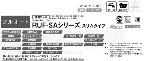 【セット内容】 (1)RUF-SA1615AB(A) ・給湯器本体 ※リモコンは別売です。 【規格・特徴】 ・外形寸法:高さ610×幅250×奥行250mm ・質量:24kg ・PS扉内後方排気型 ・スリムタイプ ・16号 ・フルオート ・給湯・給水接続15A ・本体カラー:ユーロホワイト ・Q21機能あり ・排気筒口径:φ100 ・排気延長:7m4曲りまで ※別売のφ100排気延長部材が必要です。 ※メーカー保証は2年です。 「あんしんの3年保証」 通常1年または2年のメーカー保証期間が3年になります。お申し込み方法は商品の説明書に同封の申し込みはがきに必要事項をご記入の上お申し込みください。 ※お申し込みいただいたお客様のみが対象となります。 ※業務用としてお使いの場合は対象外となります。 【別売部材】 ・ハイグレードリモコンセット(インターホン) MBC-302VC(C) ・ベーシックリモコンセット(インターホン) MBC-240VC(A) ・ベーシックリモコンセット(音声ガイド) MBC-240V(A) ・2芯ケーブル UC-25-10A ・2芯コネクタ付ケーブル UC-25C-10A ・循環金具LQ型 UF-A110LQ ・循環金具SQ型 UF-A110SQ ・配管カバー WOP-K101(K)UW ・据置台 WOP-D201UW ・扉内設置用取付BOX(PS金枠550) UOP-5030-1 ・扉内設置用取付BOX(PS金枠340) UOP-5030-2 ・扉内設置用取付BOX(PS金枠2連用) UOP-5030-3 【商品説明】 お湯はりからおいだき、保温、たし湯まですべておまかせ全自動。 【大型商品の配送について】 ■基本ドライバー1人で訪問の為、荷下ろしの際にお手伝いできる方が必要となります。 ■大型トラック(4t車)にて配送となります。 道幅6m(一般的な軽自動車がすれ違える道幅)以下の場合、配達ができません。 ※別途追加料金が発生いたしますが、2tトラックでの手配が可能です。 階段、狭所など困難な場合はご相談ください。 ■時間指定が出来かねます。 その為、必ず連絡が取れる電話番号と荷受人の名前を記載ください。 当日の配送時間(目安)については、配送前にドライバーよりご連絡させて頂きます。 Rinnai リンナイ給湯器 非エコ RUF-SAシリーズ 2023年7月発売リンナイRUF-SA1615AB-A