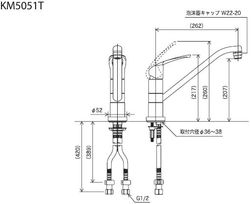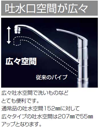 【規格・特徴】 ・寒冷地 ・泡沫 ・セラミックシングル ・省施工仕様 ・逆止弁なし ・馬蹄式六角ナット/ブレードホース・クイックファスナー式 ・吐水口空間広々タイプ207mm 広々吐水空間で洗い物などとても便利です。 通常品の吐水空間152mmに対して、広々タイプの吐水空間は207mmで55mm アップとなります。 広々吐水口KVKKM5051ZT