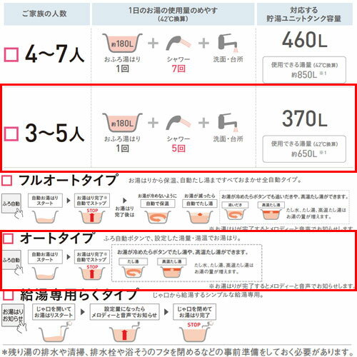 【セット内容】 (1)EQA37ZSVH ・貯湯ユニット TUA37ZSVH ・ヒートポンプユニット RQW45ZVH (2)KYP060A4 ・貯湯ユニット用転倒防止金具 ※貯湯タンクの転倒防止の為、基本セットに上部固定金具も含みます。 (3)BRC083H2 ・スタイリッシュリモコン(浴室/台所)※無線LAN対応 (4)KKC022E4 ・脚部カバー ※設置工事費、部材費など、別途必要となります。 ※メーカー保証は2年間です。 【規格・特徴】 ・オート ・370L(3〜5人用) ・パワフル高圧330kPa(減圧弁) ・Aシリーズ ・屋外設置 ・一般地 ・耐重塩害仕様 【サイズ】 貯湯ユニット ・外形寸法(mm):幅630×高さ1,825×奥行730 ・質量/満水時(kg):57/427 ヒートポンプユニット ・外形寸法(mm):幅825(+74)×高さ635×奥行300 ・質量(kg):51 【別売部材】 ・サブリモコン BRC083H41 ・リモコンコード(5m) KRCW301A05 ・風呂接続アダプター(L字) KWA948D41※1 ・風呂接続アダプター(ストレート) KWA948D42※1 ・漏れ検査治具 KWA947A4G ※1 こちらを据付けるときは、必ず漏れ検査治具(KWA947A4G)を使用し、漏れ検査を行ってください。 【機能】 「清潔・快適・安心」 ・スマート貯湯 ・ターボ沸き上げ ・沸き増し能力アップ ・あらかじめ霜取り ・ツイン給湯 ・パワフル高圧給湯(330kPa) ・気象警報緊急沸き上げ(アプリ対応) ・チャイルドロック ・非常用水取出し ・降雪対応ファン機能 「便利」 ・昼間シフト天気予報連動(アプリ対応) ・昼間シフト機能 ・沸き上げ一時休止 ・沸き上げ休止設定 ・沸き増し ・おまかせ/たっぷり/少なめ ・じゃ口閉め忘れお知らせ ・給湯量お知らせ 「おふろ」 ・ふろ自動(設定湯量のお湯はりのみ) ・たし湯 ・高温たし湯 ・たし水 「リモコン」 ・無線LAN対応 ・エコ確認 ・コミュニケーション(通話) ・設定ナビ表示 ・サービスTEL表示 ・サブリモコン対応(別売) ・試運転ナビ 「その他」 ・電力契約設定(電力プラン設定/マニュアル設定) ・電力抑制設定 ・ピークカット設定 ・ECHONETLite規格準拠 ・ECHONET LiteWeb API対応 【商品説明】 「お風呂でOFFろう」 ダイキンエコキュートで、お風呂の気になるお悩みや、1日の疲れをオフ。 いろんな機能でお風呂の時間がもっと快適で楽しくなります。 【地下水・井戸水対応商品について】 ダイキン独自の水質判定基準を満たし、弊社が認めたものはエコキュートをご使用いただけます。 ご検討前に、まずは、水質検査でご使用可能かお確かめ下さい。 ・ダイキン独自の水質判定基準で検査 ・判定まで約1週間程度かかります。 ・水質検査の結果、適用可の場合は有償、適応不可の場合は無償となります。詳しくはお問い合わせください。 【メーカー直送便の注意事項】 下記の条件がございますので、商品によってはご準備くださいますようお願い致します。 ※別途金額が発生する場合がありますので必ずご一読ください。 ■商品お渡しについて 基本ドライバー1人で訪問の為、荷下ろしの際にお手伝いできる方が必要となります。 集合住宅の場合は1階及びエントランス、戸建住宅の場合は玄関先でのお引き渡しとなります。 ■配送車について 一般的な宅配業者でございません。メーカー指定の大型トラック(4t車)にての配送となります。 道幅6m(一般的な軽自動車がすれ違える道幅)以下の場合、配達ができません。 別途追加料金が発生いたしますが、2tトラックでの手配が可能です。 階段、狭所など困難な場合はご相談ください。 ■商品お届け日について メーカーに在庫があり、日にち指定がない場合は、翌日、または翌々日のお届けとなります。ご希望日がありましたらご注文フォームの「お届け日時」にご記入ください。(平日のみ) 納期要確認の記載のある商品や受注生産商品の場合、納期にお時間が掛かります。詳細な納期については商品により異なりますので、改めて当店よりご連絡させて頂きます。 ■お届け時間について 時間指定が出来かねます。必ず連絡が取れる電話番号と荷受人のお名前を記載ください。 当日の配送時間(目安)については、配送前にドライバーよりご連絡させて頂きます。 (配送前連絡はサービスとなりますので確約するものではございません) ■不在時の再配達について 不在の場合は運送会社が持ち帰り、当日の再配達が出来かねます。 また保管料・再配達の手数料が発生する場合(お客様負担)がございますのでお届け日には必ずご在宅いただけますようお願い致します。 ■配送エリアについて 沖縄・離島地域の場合、別途費用がかかる場合がございます。 ■お支払い方法について 「後払い」「クレジットカード」「銀行振込」「郵便振替」のみとなります(代金引換は不可)。 ご入金確認後にメーカーへ発注させていただきます。 【大型商品の配送について】 ■基本ドライバー1人で訪問の為、荷下ろしの際にお手伝いできる方が必要となります。 ■大型トラック(4t車)にて配送となります。 道幅6m(一般的な軽自動車がすれ違える道幅)以下の場合、配達ができません。 ※別途追加料金が発生いたしますが、2tトラックでの手配が可能です。 階段