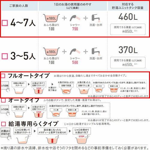 ※こちらの機種はウルトラファインバブル対応機種となりますが、この機能に必須の専用循環アダプターが メーカーにて一時出荷見合わせ中となっております。タイミングによってはかなり納期が掛かる場合や品番変更になる場合がございます。 予めご了承ください。 【セット内容】 (1)EQN46ZFVE ・貯湯ユニット TUN46ZFVE ・ヒートポンプユニット RQW60ZVE (2)KYP060A4 ・貯湯ユニット用転倒防止金具 ※貯湯タンクの転倒防止の為、基本セットに上部固定金具も含みます。 (3)BRC083H1 ・スタイリッシュリモコン(浴室/台所)※無線LAN対応 (4)KKC022E4 ・脚部カバー ※設置工事費、部材費など、別途必要となります。 ※メーカー保証は2年間です。 【規格・特徴】 ・フルオート ・460L(4〜7人用) ・高圧210kPa(減圧弁) ・Nシリーズ ・屋外設置 ・一般地 ・耐塩害仕様 【サイズ】 貯湯ユニット ・外形寸法(mm):幅630×高さ2,175×奥行730 ・質量/満水時(kg):68/528 ヒートポンプユニット ・外形寸法(mm):幅825(+74)×高さ635×奥行300 ・質量(kg):52 【別売部材】 ・サブリモコン BRC083H41 ・リモコンコード(5m) KRCW301A05 ・ウルトラファインバブルアダプター(吸気チューブ浴室内取付タイプ) KWA083A41※1※2 ・ウルトラファインバブルアダプター(吸気チューブ浴室外取付タイプ) KWA083A42※1※2 ・風呂接続アダプター(L字) KWA948D41※1 ・風呂接続アダプター(ストレート) KWA948D42※1 ・漏れ検査治具 KWA947A4G ※1 こちらを据付けるときは、必ず漏れ検査治具(KWA947A4G)を使用し、漏れ検査を行ってください。 ※2 配管長に制約があります。配管サイズ10Aの場合、3m以下(5曲がりまで)、13Aの場合は5m以下(5曲がりまで) 【機能】 「清潔・快適・安心」 ・自動ふろ配管洗浄 ・ふろ配管洗浄 ・スマート貯湯 ・ターボ沸き上げ ・沸き増し能力アップ ・あらかじめ霜取り ・ツイン給湯 ・高圧給湯(210kPa) ・ウルトラファインバブル入浴(オプション機能)※別売の専用アダプターが必要 ・温浴タイム ・気象警報緊急沸き上げ(アプリ対応) ・チャイルドロック ・非常用水取出し ・降雪対応ファン機能 「便利」 ・昼間シフト天気予報連動(アプリ対応) ・昼間シフト機能 ・沸き上げ一時休止 ・沸き上げ休止設定 ・沸き増し ・おまかせ/たっぷり/少なめ ・じゃ口閉め忘れお知らせ ・給湯量お知らせ 「おふろ」 ・ふろ自動 ・自動保温 ・自動たし湯 ・自動たし湯入切設定 ・追いだき ・たし湯 ・高温たし湯 ・たし水 ・エコふろ保温 「リモコン」 ・無線LAN対応 ・エコ確認 ・コミュニケーション(通話) ・設定ナビ表示 ・サービスTEL表示 ・サブリモコン対応(別売) ・試運転ナビ 「その他」 ・電力契約設定(電力プラン設定/マニュアル設定) ・電力抑制設定 ・ピークカット設定 ・ECHONETLite規格準拠 ・ECHONET LiteWeb API対応 【リモコンについて】 ※セットに含んでいますリモコンは、スタイリッシュリモコン(ホワイト)となりますが、 ブラックリモコンに変更が可能です。ご希望の場合はお知らせください。別途追加費用が発生いたします。 【商品説明】 「お風呂でOFFろう」 ダイキンエコキュートで、お風呂の気になるお悩みや、1日の疲れをオフ。 いろんな機能でお風呂の時間がもっと快適で楽しくなります。 【地下水・井戸水対応商品について】 ダイキン独自の水質判定基準を満たし、弊社が認めたものはエコキュートをご使用いただけます。 ご検討前に、まずは、水質検査でご使用可能かお確かめ下さい。 ・ダイキン独自の水質判定基準で検査 ・判定まで約1週間程度かかります。 ・水質検査の結果、適用可の場合は有償、適応不可の場合は無償となります。詳しくはお問い合わせください。 【メーカー直送便の注意事項】 下記の条件がございますので、商品によってはご準備くださいますようお願い致します。 ※別途金額が発生する場合がありますので必ずご一読ください。 ■商品お渡しについて 基本ドライバー1人で訪問の為、荷下ろしの際にお手伝いできる方が必要となります。 集合住宅の場合は1階及びエントランス、戸建住宅の場合は玄関先でのお引き渡しとなります。 ■配送車について 一般的な宅配業者でございません。メーカー指定の大型トラック(4t車)にての配送となります。 道幅6m(一般的な軽自動車がすれ違える道幅)以下の場合、配達ができません。 別途追加料金が発生いたしますが、2tトラックでの手配が可能です。 階段、狭所など困難な場合はご相談ください。 ■商品お届け日について メーカーに在庫があり、日にち指定がない場合は、翌日、または翌々日のお届けとなります。ご希望日がありましたらご注文フォームの「お届け日時」にご記入ください。(平日のみ) 納期要確認の記載のある商品や受注生産商品の場合、納期にお時間が掛かります。詳細な納期については商品により異なりますので、改めて当店よりご連絡させて頂きます。 ■お届け時間について 時間指定が出来かねます。必ず連絡が取れる電話番号と荷受人のお名前を記載ください。 当日の配送時間(目安)について