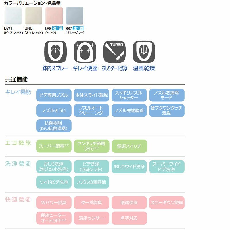 ※詳しい便器品番をお知らせ頂ければ、対応便座をお調べいたします。 【規格・特徴】 ・給湯方式(タンク容量):貯湯式(0.76L) ・大型共用サイズ ・寸法:W487mm×D553mm×H160mm ・手動ハンドル式 ・電源:AC100V ・コード長さ:有効1.0m 【機能】 [グレード別機能:KB32Aグレード] ・鉢内スプレー ・キレイ便座 ・おしりターボ洗浄 ・温風乾燥 [共通機能] ■洗浄機能 ・おしり洗浄(泡ジェット洗浄) ・おしりワイド洗浄 ・ビデ洗浄(泡沫ソフト) ・スーパーワイドビデ洗浄 ・ワイドビデ洗浄 ・ノズル位置調節 ■快適機能 ・Wパワー脱臭 ・ターボ脱臭 ・暖房便座 ・スローダウン便座 ・便座ヒーターオートOFF ※お買い上げ時は設定されていません。設定など詳しくは購入後に取扱説明書を参照ください。 ・着座センサー ・点字対応 ■キレイ機能 ・本体スライド着脱 ・スッキリノズルシャッター ・ノズルオートクリーニング ・ノズルそうじ ・ノズル先端着脱 ・ノズルお掃除モード ・ビデ専用ノズル ・便フタワンタッチ着脱 ・抗菌樹脂(ISO抗菌準拠) ■エコ機能 ・スーパー節電 ※お買い上げ時は設定されていません。設定など詳しくは購入後に取扱説明書を参照ください。 ・ワンタッチ節電(8h) ※お買い上げ時は設定されていません。設定など詳しくは購入後に取扱説明書を参照ください。 ・電源スイッチ 【カラー】 ・ピュアホワイト(BW1) ・オフホワイト(BN8) ・ピンク(LR8) ・ブルーグレー(BB7) 【納期】 ピンク(LR8)、ブルーグレー(BB7)は受注生産色で納期が約1週間必要です。 【脱臭カートリッジの交換について】 脱臭カートリッジ(CWA-29)の寿命は約7年です。 ニオイが気になりだしたら新しいカートリッジに交換して下さい。 【商品説明】 場所を選ばない、本体操作のお掃除ラクラクスタンダードモデル。 グレード別機能で特徴的なものは、温風乾燥があります。 【メーカー直送便の注意事項】 下記の条件がございますので、商品によってはご準備くださいますようお願い致します。 ※別途金額が発生する場合がありますので必ずご一読ください。 ■商品お渡しについて 基本ドライバー1人で訪問の為、荷下ろしの際にお手伝いできる方が必要となります。 集合住宅の場合は1階及びエントランス、戸建住宅の場合は玄関先でのお引き渡しとなります。 ■配送車について 一般的な宅配業者でございません。メーカー指定の大型トラック(4t車)にての配送となります。 道幅6m(一般的な軽自動車がすれ違える道幅)以下の場合、配達ができません。 別途追加料金が発生いたしますが、2tトラックでの手配が可能です。 階段、狭所など困難な場合はご相談ください。 ■商品お届け日について メーカーに在庫があり、日にち指定がない場合は、翌日、または翌々日のお届けとなります。ご希望日がありましたらご注文フォームの「お届け日時」にご記入ください。(平日のみ) 納期要確認の記載のある商品や受注生産商品の場合、納期にお時間が掛かります。詳細な納期については商品により異なりますので、改めて当店よりご連絡させて頂きます。 ■お届け時間について 時間指定が出来かねます。必ず連絡が取れる電話番号と荷受人のお名前を記載ください。 当日の配送時間(目安)については、配送前にドライバーよりご連絡させて頂きます。 (配送前連絡はサービスとなりますので確約するものではございません) ■不在時の再配達について 不在の場合は運送会社が持ち帰り、当日の再配達が出来かねます。 また保管料・再配達の手数料が発生する場合(お客様負担)がございますのでお届け日には必ずご在宅いただけますようお願い致します。 ■配送エリアについて 沖縄・離島地域の場合、別途費用がかかる場合がございます。 ■お支払い方法について 「後払い」「クレジットカード」「銀行振込」「郵便振替」のみとなります(代金引換は不可)。 ご入金確認後にメーカーへ発注させていただきます。 リクシル 温水洗浄便座 シャワー便座 暖房洗浄便座 シャワートイレ 大型共用便座 おしり洗浄 手動ハンドル式 2026年2月発売LIXILCW-KB32A