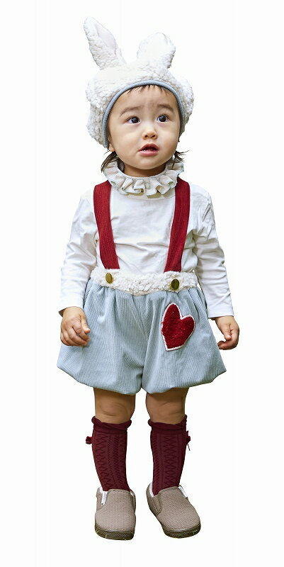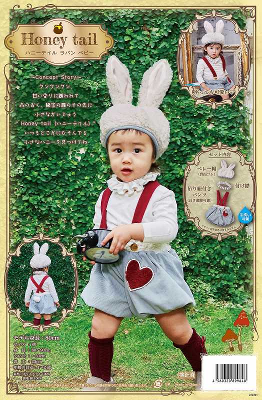普段着にアニマルモチーフを落とし込み、モノトーンやくすみカラーなど色味にもこだわった新シリーズ「Honey tail(ハニーテイル)」。全ての愛するかいじゅうたちへ。SNSアンケートをとりながらママがほしい!着せたい!を形にしました。うさ耳が可愛いベレー帽は被り口のベビーブルーが差し色に。後ろがゴムになっているので脱げにくいのも嬉しいポイント。深めに被ると耳がしっかり立ちます。ピエロ襟付き。パンツのベルト部分はベレー帽と同じもこもこ素材。ゴールドの飾りボタン付き。ハートのワッペンはアリスに出てくるうさぎのイメージ。パンツの紐は後ろボタンで長さの調整が可能。裏地は綿100%で肌触りも柔らか。ウエスト、裾口もゴムなので着脱簡単。ベレー帽もパンツも単品コーデが楽しめます。【セット内容】ベレー帽、付け襟、吊り紐付きパンツ【素材】生地/ポリエステル100%、裏地/綿100%【洗濯表示】洗濯機不可、弱い手洗い可、塩素系漂白剤による漂白不可、アイロン不可、ドライクリーニング不可【商品サイズ】袋入りパッケージ有(W260×H390×D50mm)【総重量】300g【対応サイズ】80/1〜2歳目安、身長 80〜90cm、B 〜50cm、W 〜50cm【メイン部分の長さ(着丈等)】パンツ23cm【開き】パンツ/ウエストゴム【モデル身長】80cm【モデル着用サイズ】80〜90【バスト実寸】-【ウエスト実寸】40〜50cm【ヒップ実寸】86cm【肩幅実寸】-【袖丈実寸】-【股下実寸】-【モデル名】-【その他のパーツ情報】耳の長さ12cm、頭囲44〜50cm、付け襟32cm【裏地の有無】有り【商品についての注意事項】装飾部分の引っ掛かりや巻き込みに十分ご注意ください。保護者同伴でのご使用をお願い致します。装飾パーツを口に入れることの無いようご注意ください。就寝時のご使用はお止めください。※生産時期やロット、デザインによって、多少サイズ・色・柄が異なる場合があります。摩擦や水濡れにより色移りする恐れがありますのでご注意ください。※商品画像は可能な限り実物の色に近づくよう調整しておりますが、お使いのモニター設定、お部屋の照明等により実際の商品と色味が異なって見える場合がございます。又、同じ商品の画像でも、撮影環境によって画像の色に差異が生じる場合がございます。【必ずご確認ください!】※ビニール開封後の商品は、不良品の場合を除き、返品・交換ができません。商品到着後に必ず、すぐにご確認ください。不良品の場合は1週間以内にご連絡いただかないとご対応ができなくなります。(ご不明な点は、お気軽にお問い合わせ下さい)※商品のデザインは、多少変更される場合があります。掲載写真の色は、実際の商品と多少異なって見える場合があります。【ご注意】弊社は楽天市場内で複数店舗運営しております。弊社運営の店舗で同じ商品をご購入の場合は、在庫が不足する場合があります。
