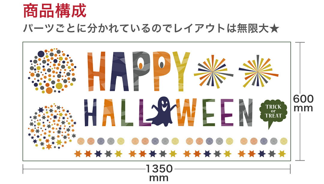 ハロウィン☆シール式ウォールステッカー halloween かぼちゃ おばけ ランタン 怖い パーティ 文字 魔女 かわいい おしゃれ 大人 trick or treat ジャック・オ・ランタン お菓子 剥がせる カッティングシート wall sticker 雑貨▼ハロウィン全デザインはこちらから▼●対象の壁/壁紙の素材について ツルツルの壁や家電、少し凹凸のあるタイプの壁紙に適しています。 砂壁や土壁、防汚加工がされた高機能壁紙はとても剥がれやすい為、おすすめしません。●貼り直しについて 位置調整などは可能ですが、何度も貼り直すと徐々に粘着力が落ち、剥がれやすくなるため 基本的には部屋や場所を変えての貼り直しには対応しておりません。●カラーの見え方について 透明シートに印刷された商品ですので、白や淡色の壁でお楽しみ下さい。 黒や濃色の壁に貼りますと色が沈み、本来のデザインが表現されません。 また光が強く当たる場所のガラスに貼った場合、色が薄く透けて見える場合があります。●交換・返品について 画像はサンプルイメージですので、ご覧の環境によって色味に違いを感じる場合があります。 イメージ違い、モニターと色味が異なるという理由での交換や返金はご対応出来かねます。 受注生産品のため、不良品以外のご返品や交換は固くお断り致します。●配送について 完全受注生産商品となりますので、発送までお時間を頂いています。 基本的に決済確認後、順次発送致しますが、最大で10営業日程度での発送となります。 繁忙期や休業日明けなどでお時間がかかる場合は別途メールにてご連絡致します。