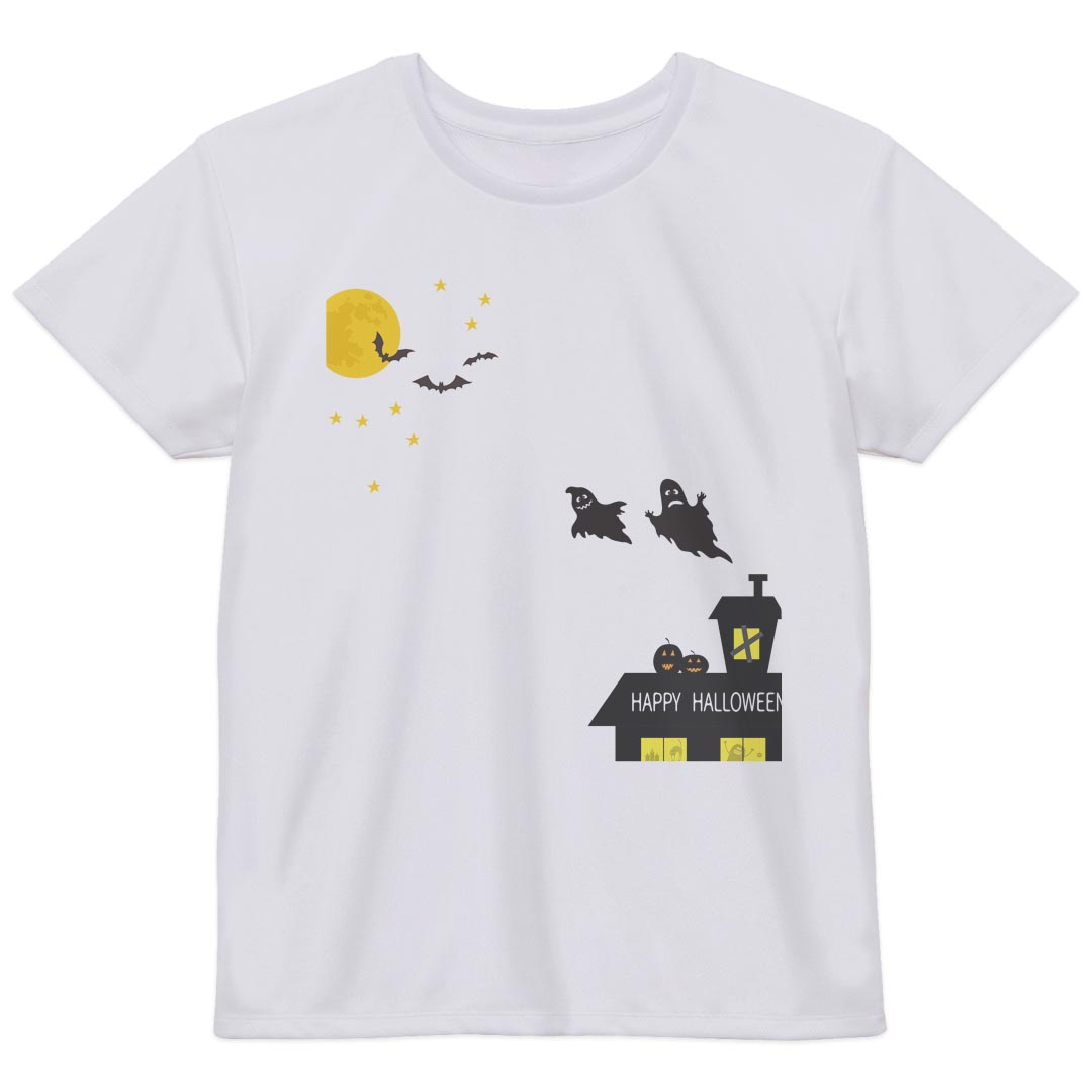 レディース ドライTシャツ ホワイト 半袖 4.1オンス ジム トレーニング スポーツ 運動会 ドライアスレチック UVカット 紫外線遮蔽 吸水速乾 デザイン Tshirt M L 026128 屋敷 かわいい Halloween