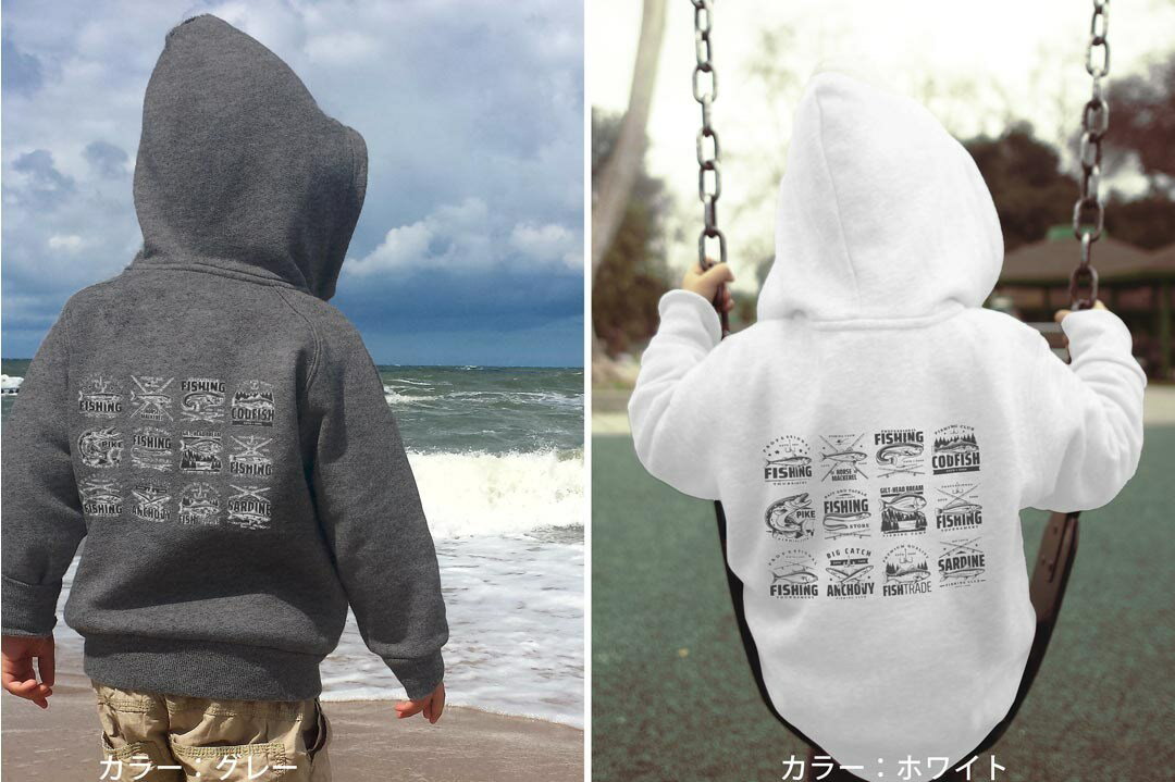 選べる3カラー パーカー スウェット バックプリントキッズ 男女兼用 男の子 女の子 ユニセックス unisex 長袖 デザイン リブ 110 130 150 parker sweat 032169 fishing