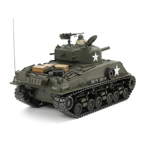 【 M4シャーマン 105mm榴弾砲搭載型について 】第二次大戦中に約50,000輌が生産され、連合軍を勝利に導いた傑作戦車シャーマンシリーズ。数多くの派生型が登場した中で、火力支援用として開発されたのがM4シャーマン105mm榴弾砲搭載型です。圧延鋼板を溶接した車体に、航空機用をベースとしたコンチネンタル・モーターズ製の空冷星型9気筒エンジンを搭載。動力伝達装置はリヤエンジン、フロントドライブ方式で、前進5段・後進1段のトランスミッションを装備。105mm砲は榴弾をはじめ、発煙弾や焼夷弾の発射も可能でした。足まわりをVVSS(垂直渦巻スプリング・サスペンション)から、HVSS(水平渦巻スプリング・サスペンション)に改良した後期型は約840輌が生産され、欧州から太平洋戦域まで幅広い戦線に配備。歩兵支援や陣地攻撃などの火力支援を中心に、大口径砲を活かして先陣を切っての戦車戦闘にも出動するなど奮戦したのです。【 M4シャーマンの制御差動式操向装置 】第二次大戦中の一般的な戦車は、曲がる方向のスプロケットにブレーキをかけて減速し、左右の履帯に回転差を生み出して旋回する「クラッチ・ブレーキ式」と呼ばれる操向装置を備えていました。これは片側の履帯を完全に停止させて旋回する信地旋回が可能でしたが、履帯を止めずに旋回する緩旋回時にはブレーキやクラッチの繊細な操作が求められ、駆動ロスの発生に加えて、ブレーキの過熱などの構造的な問題がありました。 M4シャーマンに搭載されたのは、これらの問題を解決する「クレトラック式」と呼ばれる「制御差動式操向装置」。旋回時に片側のスプロケットにブレーキをかける仕組みこそ同じですが、内部に組み込まれたディファレンシャルギヤにより片方をブレーキで減速させると、もう一方が増速し、ほぼ一定の回転半径でスムーズな旋回が可能。さらに、緩旋回中は履帯が完全に停止しないため、駆動ロスも最小限でブレーキの過熱問題も克服しました。優れたメカニズムによる機動力が高く評価され、M4シャーマンをはじめ、M24やM8、M2高速トラクターなど多くのアメリカ軍車輌がこの方式を採用。連合軍の勝利に大きく貢献したのです。【 実車に近い操向機構を採用して、RCカーと同様に操作が可能 】●M4シャーマン105mm榴弾砲搭載型を1/16スケールで再現した電動ラジオコントロールタンクの組み立てキットです。●実車同様の「制御差動式」操向装置を搭載。●ドライブスプロケット、サスアーム、アイドラーホイール基部は金属製。●金属製コイルスプリングを使用したHVSS(水平式懸架装置)はフル可動。●履帯は硬質プラスチック製。連結ピンとコネクターは金属製で連結組み立て済み。【 RC M4シャーマンの操向装置 】RC M4シャーマンには実車の制御差動式操向装置と基本的に同じメカニズムで作動する操向装置を搭載しました。540モーターのパワーは、車体前部に搭載されたデフユニットを介して左右スプロケットに伝達。左右の履帯が同速で回転することで直進し、回転差を生み出して旋回します。旋回はステアリングサーボで、デフユニット両サイドのブレーキディスクの片側を制動。右側にブレーキをかければ右に旋回、左側にブレーキをかければ左に旋回。さらに、デフユニットに内蔵された一対のプラネタリータイプのギヤボックスがデフギヤとして機能し、片側を減速させるともう一方が増速します。【 基本スペック 】●全長376mm、全幅183mm、全高205mm。●走行用540モーター1個付き ●スピードコントローラー=ESC仕様(別売)【 別にお求めいただくもの 】●ファインスペック 2.4G 電動RCドライブセット ●送信機用単3形電池4本メーカー:タミヤJAN:4950344560486全長=376 mm 写真はキットを組み立て、塗装したものです