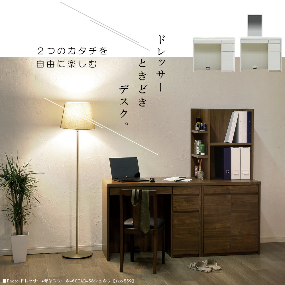 商品情報 材質 ・BR/強化紙(ウォールナット柄) ・WH/ハイグロスシート(白木目) サイズ ドレッサー:幅90 奥行47 高さ72(124)cm スツール:幅34 奥行40.5 高さ72(SH42)cm カラー ・BR(ウォールナット柄) ・WH(白木目) 特徴 ■ワークデスクにもなるドレッサー ■コンセント付き ■ミラー収納可能 【送料無料】(北海道・東北6県・北陸3県(富山県・石川県・福井県)・沖縄・その他離島、一部の地域を除きます。 * 備考 ・商品は、小売と併用しておりますので、常時在庫状況が変動いたします。 在庫欠品の際は、入荷までお時間をいただく場合があります。 ・配送は全て宅配便(1人)での玄関渡しとなります。 大型商品や重量商品、エレベーターの無い2階以上にお住まいのお客様は、玄関口までの搬入のお手伝いをお願いしております事をご了承ください。 ・大型商品はドライバー1人では荷降ろしができませんので必ず力のある方のお手伝いをお願いいたします。 ・明らかに通常の流通価格を大きく下回るもしくは上回る価格の場合 誤りの可能性がございます。 ご購入前にお電話またはメールでのご確認をお願いたします。■背付スツールタイプ ■背無スツールタイプ ■キャビネット+背付スツール ■キャビネット+背無スツール
