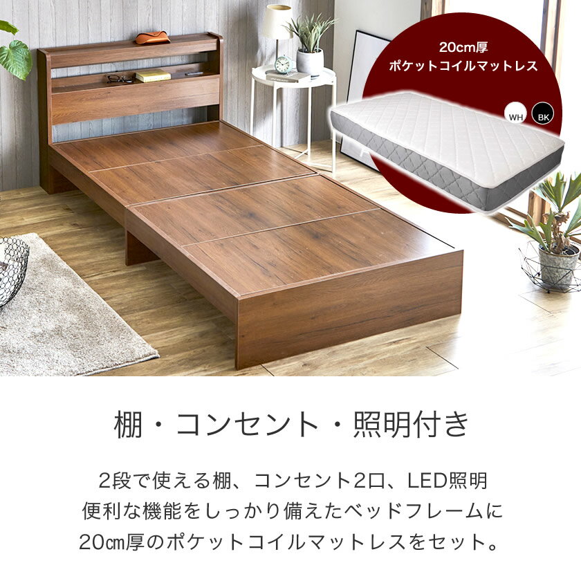 Kylee 棚付きベッド セミダブル 20cm厚ポケットコイルマットレス付き 木製 棚付き コンセント LED照明付き 木製ベッド セミダブルベッド ベット バリューマットレスセット ベッド下収納