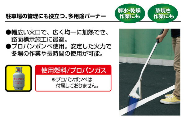 新富士バーナー ロードマーキング用 プロパンガスバーナー RM-41000 本体サイズ 全長(ホースを除く)91cm 重量1.9kg 商品説明 ●ロードマーキング用プロパンガスバーナー●広い面積や長いラインの溶着に!業務用にも使えるプロパンバーナー●幅広い火口で広く均一に加熱でき、路面標示施工に最適●プロパンボンベ使用で、安定した火力で冬場の作業や長時間の使用が可能●ビデオDVD付●使用燃料:プロパンガス※プロパンボンベは付属しておりません。●導管部長さ:45cm●ホース長さ:3m●加熱時間目安(ライン10cm×5mを溶着):約3分※外気温30度・無風状態の環境にて●火口幅:165mm(内寸)●炎形状:幅広炎●火炎温度:1,300℃●発熱量:47.3kW(40,700kcal/h)●メーカー保証1年付き 商品補足説明 YAMAZEN ヤマゼン 山善 通販 新富士バーナー Shinfuji Burner ロードマーキング ガスバーナー バーナー プロパンガス 路面標示施工 路面標示 駐車場 路面 地面 敷地 道路 標示 マーカー ライン引き サイン 補修 強力溶着式 DIYロードマーキング アクセサリー Sサイズ ロードマーキング Lサイズ ロードマーキング サイン ロードマーキング 工具 ランキング