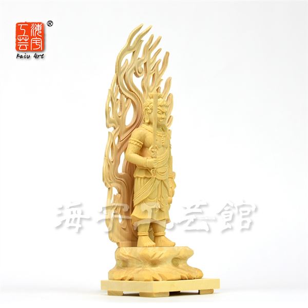 商品詳細 不動明王 「お不動さん」と庶民に親しまれている不動明王ですが、元はヒンドゥー教の破壊と救済を備えるシヴァ神に由来し、モンスーン(暴風雨)を神格化させたものだといわれています。右に剣、左手に羂索という縄をもっています。剣は大日如来の研ぎ澄まされた智慧を象徴し、羂索で煩悩を縛り付けます。坐像と立像があり、火炎の光背を背負って岩座に乗るのが一般的です。 不動明王が、密教における最高神である大日如来の一の子分であり、明王の中心的存在だから、数ある明王の中で最も人気があります。家内安全、商売繁盛、交通安全などが祈願され、盛んな信仰を集めています。 動かざる尊者という意味で、如来が教化しにくい衆生を救うために、見るからに恐ろしい形相をした姿で現れる。全ての災難苦難を除き、事故や災いから身を守ってくれる仏様と言われています。 材質:桧木(ひのき) サイズ:(約)高さ24cm×幅9.5cm×奥行6.7cm 身丈:立4.0寸 仕上げ:木地 販売元:海宇商事 製作:中国 備考: ・職人・仏師の手作業にて仕上げております。一体ごとに木目や色味等が若干異なる場合がございます。 ・写真は入荷商品の中から無作為に選んだ実際の商品です。 ・実際の商品と掲載写真では色味が異なって見えることがございます。 ・万が一在庫切れの場合は、メールにて納品予定日をお知らせいたします。以上予めご了承下さい。
