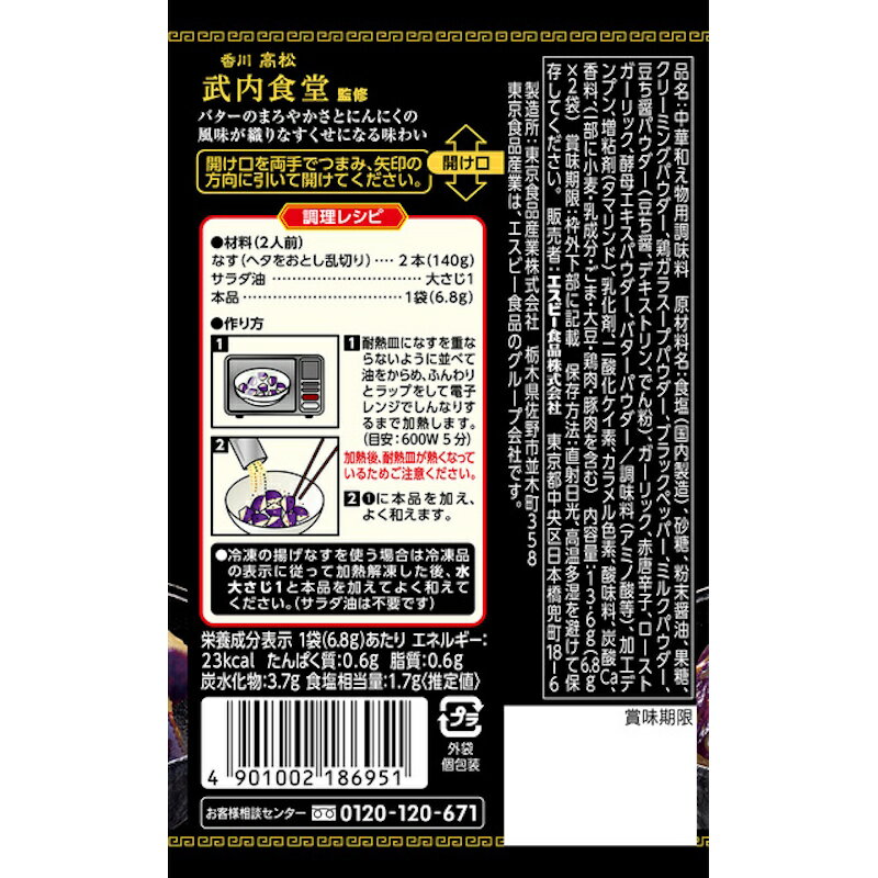 【S&B】エスビー食品 町中華\名店の裏メニュー/ガリバタなす 2人前×2回分 13.6g×10個 ●香川高松「武内食堂」監修のメニュー用シーズニング。 ●レンジアップしたなすと和えるだけ。 ●バターのまろやかさとにんにくの風味が織りなすくせになる味わい。 ・注意事項・ ・リニューアルなどにより、商品内容やパッケージが変更となり、画像と異なるものをお届けする場合がございます。 予めご了承ください。 ・当商品は終売、リニューアルになる可能性があり、ご注文をいただいた後にお届けができなくなってしまう場合が稀にございます。 その際はご連絡させていただきますので、ご了承ください。 ・賞味期限は製造日を含む、製造日からの期限です。