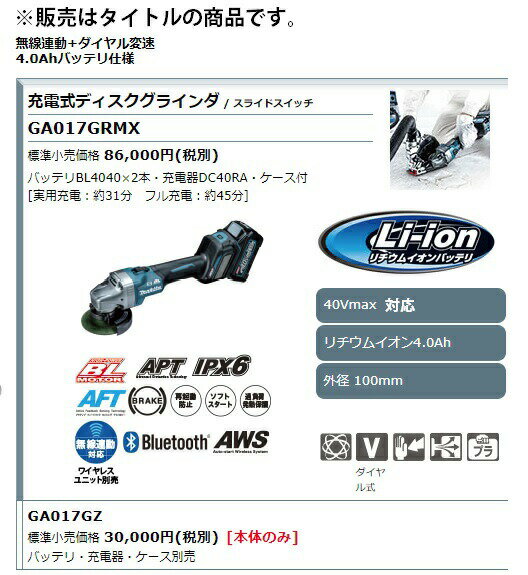マキタ 充電式ディスクグラインダ スライドスイッチ GA017GZ 本体のみ 外径100mm 回転数3000〜8500min-1 40Vmax対応 makita 特