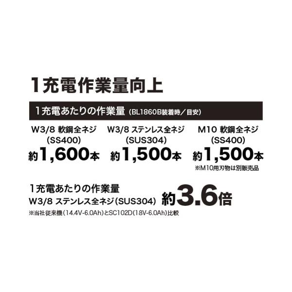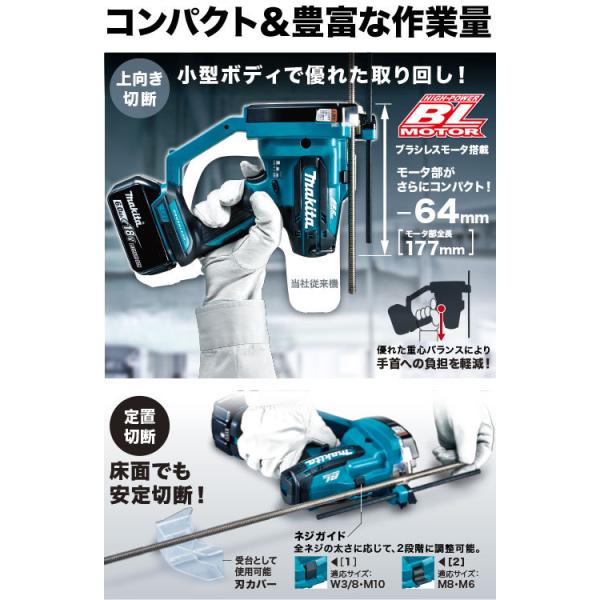 その他特長 ・LEDライト ・スケール (定寸ストッパ) ・正逆転切替 ・システムケース付 マックパックタイプ3 主要機能 最大切断能力 (mm) W3/8全ネジ:軟鋼・ステンレス M10全ネジ:軟鋼※1 最小切断 長さ(mm) 20 本機寸法 (長さ×幅×高さmm) 199×103×308 1充電あたりの作業量(BL1860B装着時/目安) ※2 W3/8 軟鋼全ネジ (SS400) 約1,600本 W3/8 ステンレス全ネジ (SUS304) 約1,500本 M10 軟鋼全ネジ※1 (SS400) 約1,500本 質量(kg) (バッテリ含む) 3.2 標準付属品 W3/8切断用刃・スケール・六角棒スパナ・刃カバー ※1 M10軟鋼全ネジは別販売の純正刃使用にて可。 ※2 数値は参考値です。バッテリの充電状態や作業条件により異なります。 [本体のみ] システムケース付 / バッテリ・充電器別売