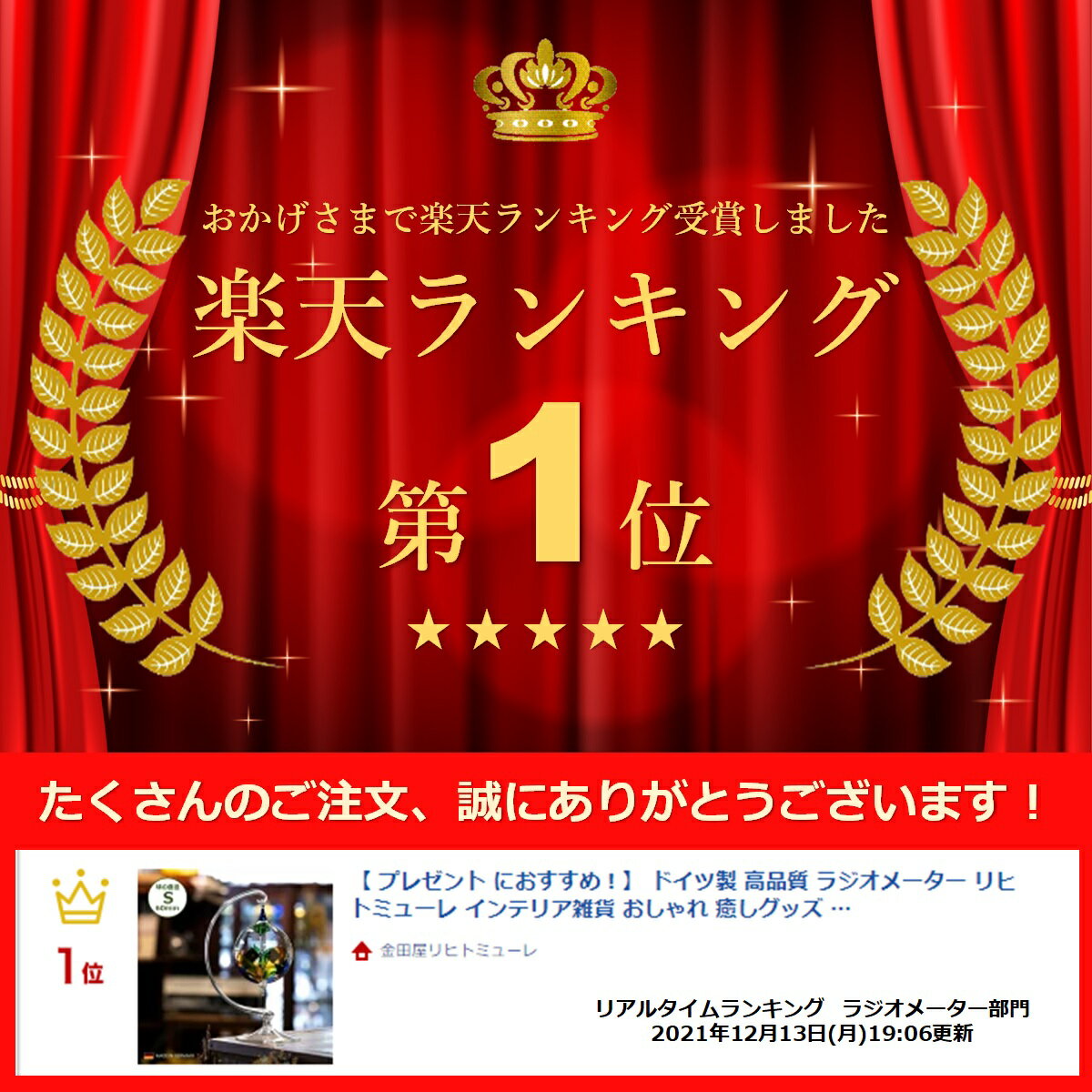 商品情報品 名ラジオメーター/リヒトミューレ材 質ガラス、雲母製造元リヒテンヘルド社生産国ドイツ輸入元金田屋リヒトミューレ ご覧頂きありがとうございます。当店は日本では珍しいドイツ製リヒトミューレ(ラジオメーター)の専門店として2011年にスタートしました。店内では常時250点以上のリヒトミューレがクルクル回っています。「ぶらり途中下車の旅」でのご紹介をきっかけに知ったという方も多いかと思います。 おかげさまで、知る人ぞ知るアイテムとして幅広い層のお客様に喜ばれています。記念日に毎年1つずつ増やすのを楽しまれているお客様や、夏休みの自由研究の題材に選ばれることも。贈り物としての需要も多く、新築祝い、お誕生日、母の日、父の日などの他、ご結婚のお祝いや引き出物としてもお選び頂けます。贈られて感動し、今度はその方が別のお友達に贈る。そんな感動の連鎖が感じられるのもこの商品の魅力だと思います。 リヒトミューレの歴史や原理が書かれた日本語の説明書と一緒に丁寧に梱包してお届け致します。品質管理には充分に配慮しておりますので、どうぞ安心してご利用くださいませ。皆様のご利用を心よりお待ちしております。 ※ 低価格の類似品とは品質・性能ともに大きく異なります。十分にご注意ください。 木更津。港の近くの小さな交差点に、ちょっと目をひく洋風のレトロ看板建築が建っている。入口には藍色の暖簾。そのショーウィンドウをのぞくと・・・そこにはヒカリをあびて、ガラスの中の小さな羽根がクルクル回る不思議なオブジェ、色とりどりの「リヒトミューレ」。その美しい姿は、みつめていると心が安らぎ、大切な何かを思い出させてくれるようです。その回転はヒカリの種類や強さによって変化し、やがてヒカリが充分でなくなると、とまってしまいます。どこか、わたしたちの心の活動にも似ているようです。 私たちは、この場所を通じて、心の羽を元気に回してくれる、素敵で心地よい生活のエッセンス、キラキラ光る、ちょっと懐かしくて、心に残る、トキメキ、やすらぎ、勇気、希望、情熱、そんな、心をゆたかにしてくれる、個性豊かに紡がれたモノ・コト・コトバを広く世界に求め、アンティーク、アート作品、ステーショナリー、書籍を中心にご紹介したいと考えています。 小さなお店ですが、自由にお使い頂ける椅子とテーブルをご用意しています。書籍類も自由にお読み頂けます。過ごし方は自由。どうぞ、ごゆっくり、おすごしください。 商品のイメージ、ご利用シーンなど 《飾る場所のイメージ》 窓 出窓 ニッチ リビング 書斎 ロビー 玄関 エントランス ショーウィンドウ カウンター デスク テーブル バー レストラン カフェ ギャラリー ショールーム 美容室 美術館 博物館 《贈答品としても大変喜ばれています》 誕生日プレゼント お祝い 内祝い 昇進祝い 定年退職 退職祝い 還暦祝い お見舞い 快気祝い 退院祝い 長寿祝い 結婚祝い 結婚記念日 金婚式 銀婚式 古希 喜寿 記念日 米寿 卒寿 出産 開店祝い 開業祝い オープン祝い 周年祝い 新築祝い 引っ越し祝い 新居 新生活 母の日 父の日 敬老の日 愛妻の日 いい夫婦の日 クリスマス バレンタイン ホワイトデー お返し プチギフト 合格祝い 卒業祝い 入学祝い 女性 女友達 女の子 大人の女性 母 祖母 おばあちゃん 男性 男友達 父 祖父 おじいちゃん 上司 先生 同僚 友達 20代 30代 40代 50代 60代 70代 80代 90代 《このようなイメージでお探しの方にオススメです》 本当に喜ばれるプレゼント 大人の女性に喜ばれるプレゼント 大人の男性に喜ばれるプレゼント ギフト 贈り物 上質なインテリア 場を楽しくするインテリア 癒しグッズ リラックスグッズ おうち時間 おしゃれ お洒落 雑貨 置物 置き物 オブジェ シンプル シック モダン レトロ アンティーク ビンテージ インスタ映え 癒し 癒やし オシャレ 個性的 ユニーク かわいい 可愛い 大人かわいい 可愛い雑貨 人と違う 不思議 面白い おもしろ 実験器具 サイエンス 科学 理科 理科室 理系女子 知育玩具 知的 アート 芸術 ドイツ 東欧 北欧 北欧雑貨 ガラス ガラス細工 ガラス工芸品 知る人ぞ知る ラジオメーター効果 クルックスのラジオメーター 光エネルギー 永久機関 自然科学 自然エネルギー ロマンチック スチームパンク 《このようなところでも使われています》 映画 テレビ番組 CM 雑誌 コマーシャル 小道具 セット 美容室 理容室 ネイルサロン 病院 ホテル 旅館 喫茶店 カフェ バー カフェバー レストラン サロン ギャラリー アートイベント マルシェ 書店 雑貨店 アパレルショップ セレクトショップ 《テレビや雑誌などでご紹介頂きました》 日本テレビ「ぶらり途中下車の旅」(2019年3月23日放送) テレビ東京「朝の!さんぽ道」(2019年3月7日放送) 増山かおり著「東京のちいさなアンティークさんぽ レトロ雑貨と喫茶店」 ネコパブリッシング「VINTAGE LIFE/ヴィンテージライフ Vol.20」「IN THE LIFE 8/インザライフ 刺激的な週末