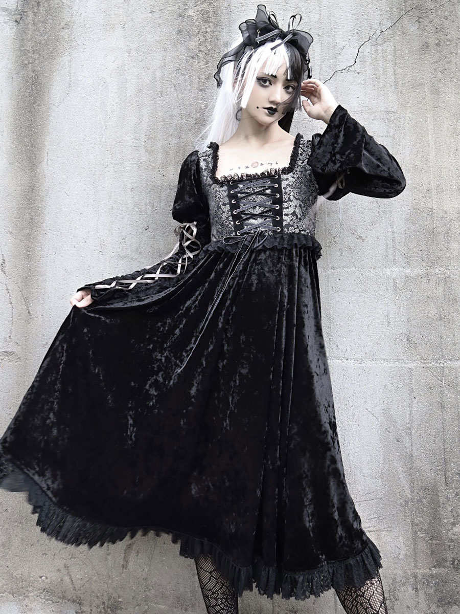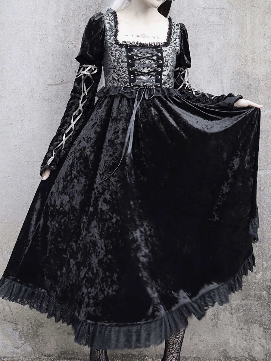 ゴシックロリータオプドレスブラックロングスリーブレースアップフリルレース花柄プリントブラックロリータワンピースドレス