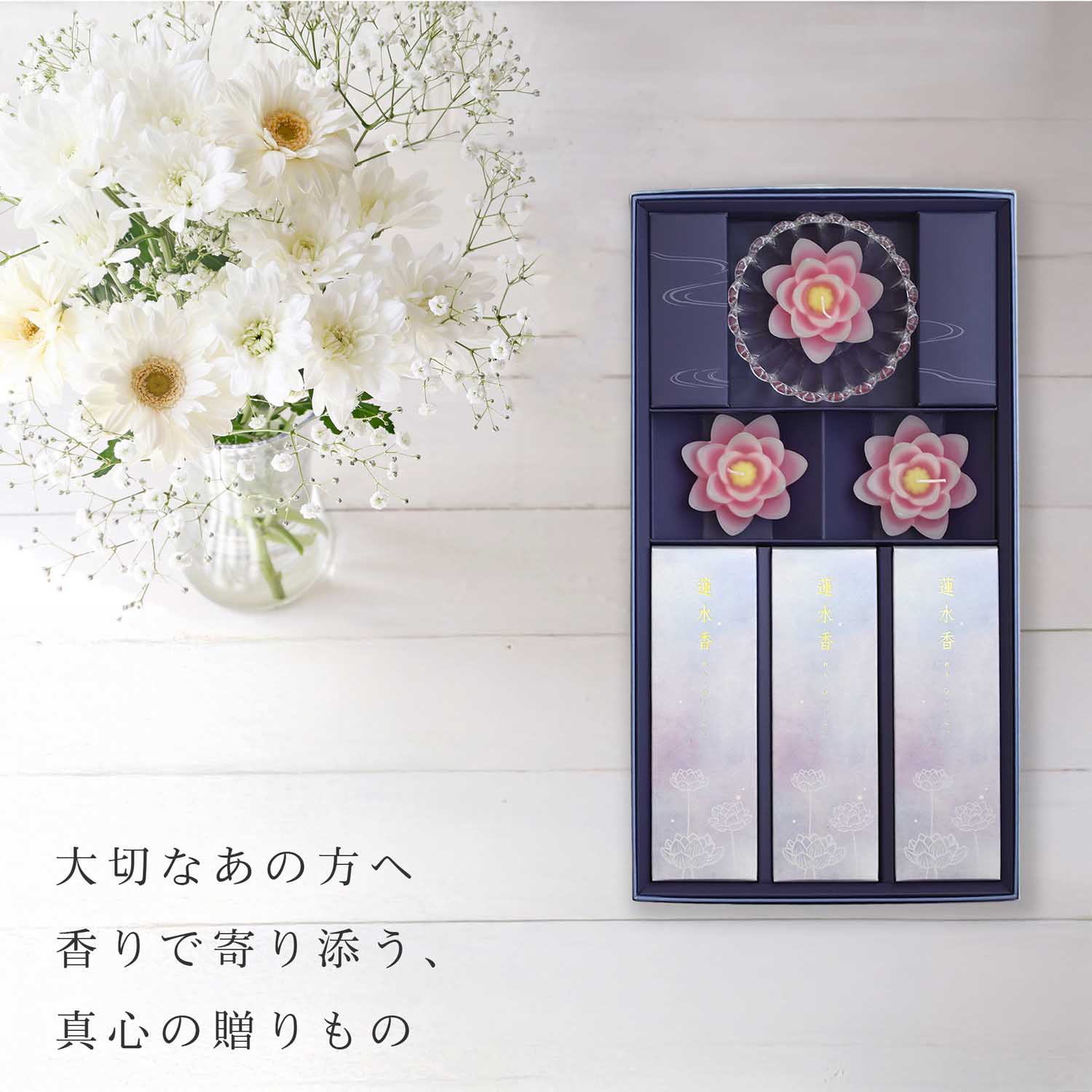 お悔やみ 線香 ギフト お供え 【 白檀 内のし ロウソク】 日本製 少煙 贈答用 お線香 仏壇用 法要 一周忌 四十九日 蓮水香