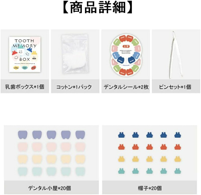 1、乳歯ボックスのパッケージ内容:乳歯ボックス1個、コットン1パック、デンタルシール2枚、ピンセット1本、産毛ボトル1本、デンタル小屋20個、帽子20個。乳歯を収納するだけでなく,特別な写真フレームとして使用できます,多機能を持つ乳歯入れは、実用性が高く。 2、ユニークなデザイン:子供用の乳歯入れは、斬新な外観と可愛らしいディテールのデザインで注目を浴び、子供たちに歯を保管する楽しみと温かさを提供します。各乳歯の収納部には透明な窓があり、子供たちが自分の貴重な歯をはっきり見ることができ、親子のコミュニケーションを楽しむことができます。 3、安全性と信頼性:高品質な天然素材を使用し、無毒で安全性が確保されています。丁寧に密閉設計された乳歯収納部は、乳歯の損傷を防ぎ、長期保存を保証し、貴重な乳歯の記録が永遠に保存されることを保証します。 4、精巧な贈り物:貴重な贈り物として、この子供用乳歯入れは出産祝い、誕生日プレゼント、または卒業祝いに子供たちに贈られるのに適しており、彼らに予想外の驚きと温かさを提供します。男女問わず、皆がこの斬新な贈り物で嬉しさと感謝の気持ちを感じるでしょう。 5、記憶の継承:この乳歯入れは子供たちの宝物だけでなく、家族の感情の継承でもあります。貴重な乳歯を集め、記録し、共有することで、家族のメンバーが一緒に子供たちの成長の重要な瞬間を目撃します。この乳歯入れを家族のためのユニークで貴重な宝にし、家族の幸福と温かさを記録します。