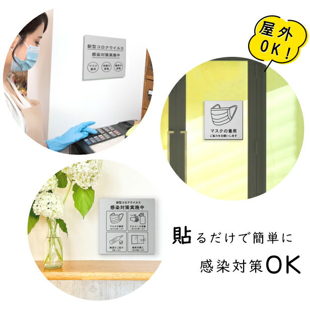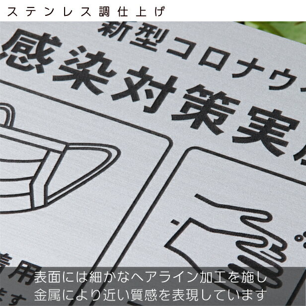 サインプレート 角丸 150×150 S (新型コロナウイルス感染対策実施中) ステンレス調 シルバー マーク付 看板 感染対策 換気対策 検温 マスク着用 アルコール消毒 アクリル製 銀 水濡れOK 日本製 シール式 メール便 送料無料