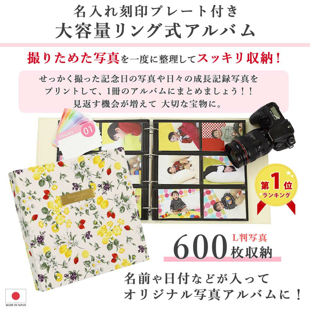 アルバム 写真 名前 刻印 大容量【花とフルーツ柄 600枚 表紙プレート シート黒】人気 おすすめ おしゃれ リフィル かわいい 書き込める 男の子 女の子 ベビー 赤ちゃん 結婚式 ウエディング 子供 台紙 整理 大量 収納 l 2l オリジナル バインダー プレゼント 日本製