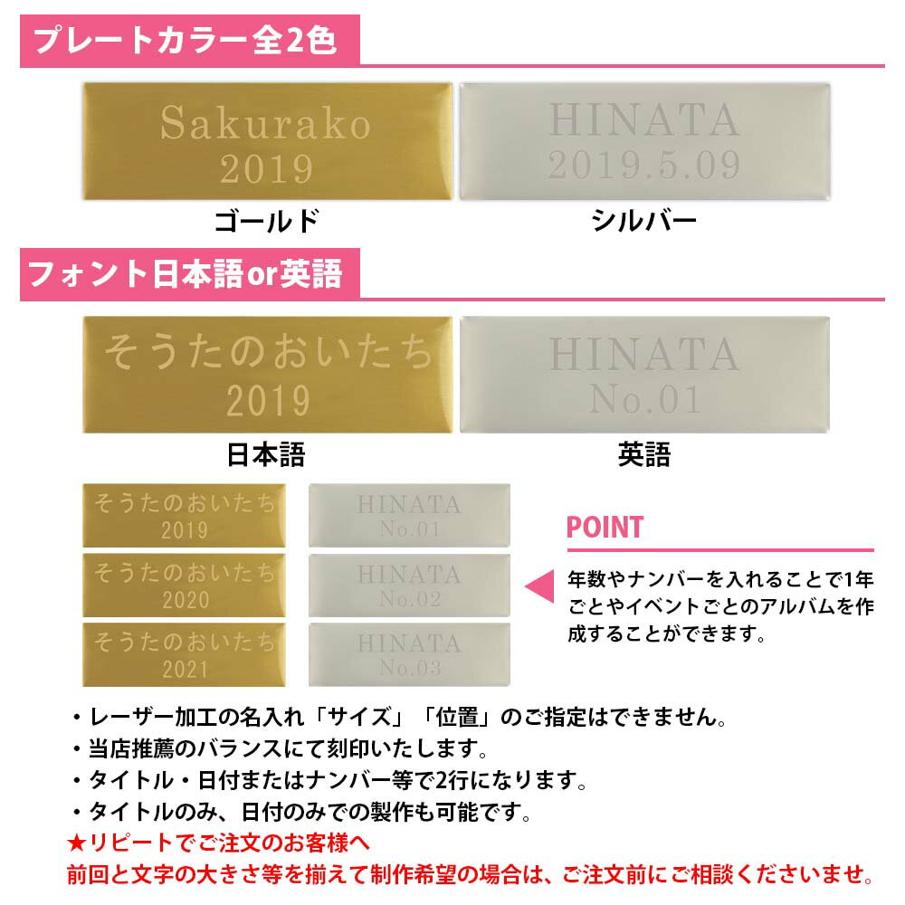 ★おすすめ ●サークル ●名入れプレートアルバム ●漢字刺繍アルバム ●写真表紙アルバム ●写真パネル ●2面デザインアルバム 商品詳細 サイズ 縦33cm 横34cm 背幅約6cm 表紙材質 布 ポケットシート数 50枚(写真600枚収納タイプ) 中シートポケットサイズ 9cm ×13cm 収納写真サイズ L判サイズ 8.9cm ×12.7cm(3.5×5 inch) プレートサイズ 外寸:25×80mm(アルミ) お名前 備考欄にお名前日付等詳細のご記載お願いします アルバムカバー 透明なアルバムカバー付き ラッピング ■お任せラッピングはこちら ※無料ラッピングは対応しておりません。 追加シート 別売あり 生産国 日本 商品について お名前プレート付きのポケットアルバムです。 簡単に大量の写真が整理、収納できます。 アルバムを開けば12枚の写真が一度に見られて、人生の大切なシーンにいつでも出会える。 布表紙でしっかりした丈夫なアルバムで大好評です。 リピート購入でシリーズで揃える方も多く、使いやすいと評判です。 さらにこのアルバムの人気の特徴は、異なるタイプのリフィルが追加できるので、 l判写真だけでなく、2l、6切、集合写真など様々な大きさの写真が1冊に収納できます。 またポケットシートは入れた写真が落ちにくいので使いやすいです。 思い出のリーフレットなども一緒に整理できる丈夫なフリーポケットも追加で収納できます。 スクラップ用シートも追加でき、オリジナルのアルバムが手作りできます。 リング式なので時系列に写真を差し込むこともでき便利です。 撮りためた写真を一度に整理してスッキリ収納できます。 アルバムは弊社オリジナル商品で、全商品高品質の日本製です。 注意事項 リング式ポケットアルバムです。 ポケットシートを取り外しする際は指を挟まないようくれぐれもご注意くださいませ。 商品によって柄の出方が異なります。 付属のポケットシートは紙製品のため、うねりが出ることがございます。アルバムは高温多湿の場所をさけて保管してください。 アルバムの表紙色は、お客様のご覧になっている画面の色と、実際の商品の色が異なることがございます。 アルバムの表紙生地は綿を使用しておりますが、綿は素材の性質上、ネップと呼ばれる繊維の節が生地表面に出来ることがございます。ネップは綿の自然で素朴なナチュラルな味わいとしてご理解くださいませ。 また、素材の特性上、色ムラ、織りムラが稀にございます。時折生地表面に見られる黒いツブは、綿実、綿糟という植物の破片で、生地を作る上では避けられず、生地の自然な風合いとして楽しんでいただけたらと思います。 生地の生産過程、ロット等により同じ柄・プリントでも多少の色の違いがある場合がございます。 落下などによる事故、及び商品破損また商品使用時に起きたケガにつきましては、当社は一切の責任を負いかねます。 あらかじめご了承くださいませ。 ポケットアルバム、フォトファイル、バインダー式フォトアルバムなど、たまった写真を簡単に整理、たくさんの写真を収納するアイテムをお探しの方にご利用いただいています。 七五三写真や記念日、ベビーの出産祝い、ウェディング写真、または入学式、卒業式、成人式や友人へのギフト・プレゼント用にも大人気の大容量バインダーポケットアルバムです。 自分用にはもちろんのこと、大切な人へのギフトとしてもご利用いただける高品質なアルバムです。 おしゃれでかわいいアルバムの表紙柄は上品な北欧風の花柄やドット、スタイリッシュなボーダー ストライプ、和柄ちりめん、シンプルな無地の多色、迷彩柄や男の子に人気の電車柄から女の子向きのキュートな柄までご用意いたしております。 中のポケットシートリフィルはさわやかな白色タイプと写真がよく映える黒色タイプがあり、100枚、240枚、500枚、600枚、1000枚、1200枚とございます。 L判サイズ用のポケットシートですが、その他の写真サイズにも対応できる粘着シート、またスクラップ帳のように手作りできるフリーの台紙もご用意があります。 リング式なのでシートが増やせて、簡単に追加ができ、昔の写真が出てきた時や、友人、ママ友から子供の幼稚園や行事の写真をいただいたときにもシートを差し込めば、時系列にそって簡単に写真を収納できるすぐれものです。 インテリアとしてもスタイリッシュに飾っていただける写真アルバムです。 赤ちゃんの誕生から、100日祝、入園、七五三、入学、卒業、発表会、成人式、結婚式の前撮り、披露宴、二次会パーティ、集合写真など、残しておきたい人生の様々な場面の大切なシーンの写真から何気ない日常の写真まで、収納して残すならハイクオリティーなしっかりしたアルバムがおすすめです。 当社商品はオリジナルで安心の日本製です。 大容量/ポケットアルバム/イヤーフォトアルバム/おしゃれ/かわいい/ベビー/結婚式/写真整理/アルバム 写真/アルバム 2l/アルバム エコー写真/アルバム a4/アルバム 黒台紙/アルバム 写真 大容量/ア