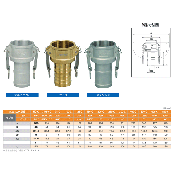 ■特徴 ●工場設備で使われているホースにはネジやフランジを使用しますがどちらも取付けには工具が必要で時間がかかります。 そこで活躍しているのがレバーカップリングです。 ●現場の方々には「レバーロック」や「カムロック」などと呼ばれております。 ●操作方法がシンプルで、レバーを操作するだけで確実に取り付けることができます。 ●様々な流体と使用環境に対応するため、4種類の本体材質(ステンレス、アルミニウム、ポリプロピレン、ブロンズ)と8種類のガスケットを用意しております。 ■用途 ●タンクローリーに積載されたホースの先端に ●小麦粉を大量に使うパン工場、製麺工場、お菓子工場では、小麦粉の搬入に ●あらゆる工場設備に ●土木現場などホースを扱う現場には必需品です ■仕様 ●材質:ステンレス ●流体:水、油、空気、薬品、粉体 検索用:小澤物産 トヨックス トヨロック マックス アダプター カプラー OZ TOYOX MAX
