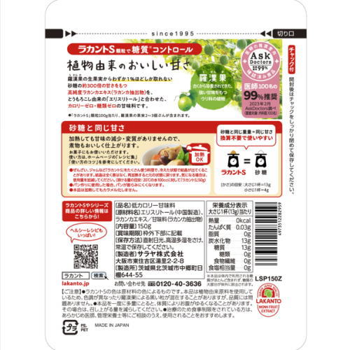 ウリ科の植物「羅漢果」と発酵ブドウ糖「エリスリトール」からつくった、カロリー0の自然派甘味料です着色料・香料無添加で煮物にもおすすめです。 ■原材料:エリステロール99.2%、甘味料(ラカンカエキス)0.8% ■使用方法:砂糖と置き換えてお使いください。 ・広告文責(健康デパート・0120-007-773) ・メーカー名(サラヤ株式会社) ・日本製 ・商品区分(健康食品)