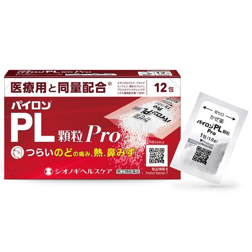 お店TOP>医薬品>風邪薬>風邪薬全部>パイロンPL顆粒Pro (12包*3箱セット(セルフメディケーション税制対象))お一人様1セットまで。医薬品に関する注意文言この医薬品は指定第2類医薬品です。小児、高齢者他、禁忌事項に該当する場合は、重篤な副作用が発生する恐れがあります。詳しくは、薬剤師または登録販売者までご相談ください。【医薬品の使用期限】使用期限120日以上の商品を販売しております商品区分:指定第二類医薬品【パイロンPL顆粒Proの商品詳細】●パイロンPL 顆粒Proは、解熱鎮痛成分であるサリチルアミドとアセトアミノフェン、抗ヒスタミン成分であるプロメタジンメチレンジサリチル酸塩、痛みをおさえるはたらきを助ける無水カフェインの4つの有効成分の作用により、「のどの痛み」「発熱」「鼻みず」などのかぜの諸症状にすぐれた効果を発揮する非ピリン系のかぜ薬です。【効能 効果】かぜの諸症状(のどの痛み、発熱、鼻みず、鼻づまり、くしゃみ、悪寒(発熱によるさむけ)、頭痛、関節の痛み、筋肉の痛み)の緩和【用法 用量】成人(15才以上)1回1包、1日4回、毎食後および就寝前に原則として4時間以上の間隔をおいておのみください。[年齡:1回量:1日服用回数]成人(15才以上):1包:4回15才未満:服用させないこと定められた用法・用量を厳守してください。【成分】パイロンPL顆粒 Proは、白色の顆粒で、4包(1g*4・成人1日量)中に次の成分を含有しています。[成分:含量(4包中):はたらき]サリチルアミド:1080mg:痛みをおさえ、熱を下げるアセトアミノフェン:600mg:痛みをおさえ、熱を下げる無水カフェイン:240mg:痛みをおさえるはたらきを助けるプロメタジンメチレンジサリチル酸塩:54mg:鼻みず、鼻づまり、くしゃみをおさえる添加物として 乳糖水和物、トウモロコシデンプン、塩化ナトリウム、白糖、含水二酸化ケイ素を含有しています。【注意事項】★使用上の注意・してはいけないこと(守らないと現在の症状が悪化したり、副作用・事故がおこりやすくなります)1.次の人は服用しないでください(1)本剤または本剤の成分によりアレルギー症状をおこしたことがある人(2)本剤または他のかぜ薬、解熱鎮痛薬を服用してぜんそくをおこしたことがある人(3)次の診断を受けた人排尿困難、胃・十二指腸潰瘍、緑内障(4)15才未満の小児2.本剤を服用している間は、次のいずれの医薬品も使用しないでください他のかぜ薬、解熱鎮痛薬、鎮静薬、鎮咳去痰薬、抗ヒスタミン剤を含有する内服薬など(鼻炎用内服薬、乗物酔い薬、アレルギー用薬など)3.服用後、乗物または機械類の運転操作をしないでください(眠気などがあらわれることがあります)4.服用前後は飲酒しないでください5.長期連用しないでください・相談すること1.次の人は服用前に医師、薬剤師または登録販売者にご相談ください(1)医師または歯科医師の治療を受けている人(2)授乳中の人、妊婦または妊娠していると思われる人(3)高齢者(4)薬などによりアレルギー症状をおこしたことがある人(5)次の症状のある人高熱(6)次の診断を受けた人心臓病、肝臓病、腎臓病、気管支喘息2.服用後、次の症状があらわれた場合は副作用の可能性があるので、直ちに服用を中止し、この文書を持って医師、薬剤師または登録販売者にご相談ください[関係部位:症状]皮膚:発疹・発赤、かゆみ、浮腫血液:皮膚や粘膜が暗紫色になる、貧血消化器:吐き気・嘔吐、食欲不振、胸やけ、腹痛、胃腸出血精神神経系:めまい、倦怠感、頭痛、耳鳴り、難聴、視覚障害、不安感、神経過敏、不眠、けいれん、軽度の意識混濁、興奮、幻覚、妄想呼吸器:せき、息苦しさ循環器:高血圧、低血圧、頻脈泌尿器:排尿困難、尿閉その他:過度の体温低下、発汗、ふるえ、鼻炎症状、結膜炎まれに下記の重篤な症状がおこることがあります。その場合は直ちに医師の診療を受けてください。[症状の名称]ショック(アナフィラキシー)/皮膚粘膜眼症候群(スティーブンス・ジョンソン症候群)、中毒性表皮壊死融解症、急性汎発性発疹性膿疱症/再生不良性貧血/無顆粒球症/血小板減少/ぜんそく/間質性肺炎/肝機能障害/腎障害/横紋筋融解症/緑内障の発作3.服用後、次の症状があらわれることがあるので、このような症状の持続または増強が見られた場合には、服用を中止し、この文書を持って医師、薬剤師または登録販売者にご相談ください口のかわき、眠気4.5〜6回服用しても症状がよくならない場合は服用を中止し、この文書を持って医師、薬剤師または登録販売者にご相談ください★保管および取扱い上の注意(1)直射日光の当らない湿気の少ない、涼しい所に保管してください。(2)小児の手の届かない所に保管してください。(3)他の容器に入れ替えないでください。(誤用の原因になったり、品質が変化します)(4)使用期限をすぎた製品は、服用しないでください。【医薬品販売について】1.医薬品については、ギフトのご注文はお受けできません。2.医薬品の同一商品のご注文は、数量制限をさせていただいておりま