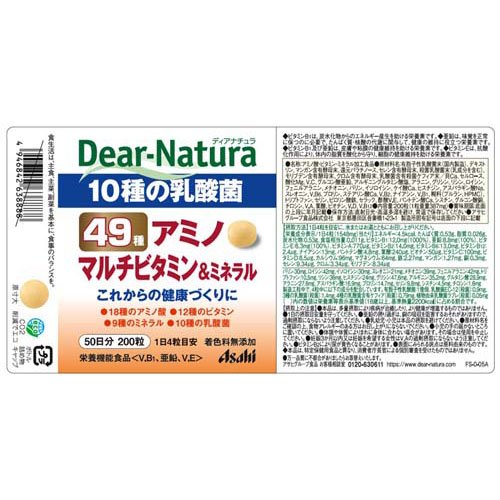 お店TOP>健康食品>ビタミン類>マルチビタミン>マルチビタミン+マルチミネラル>ディアナチュラ 49種アミノマルチビタミン&ミネラル (200粒×8セット)商品区分:栄養機能食品(栄養成分:ビタミンB1、亜鉛、ビタミンE)【ディアナチュラ 49種アミノマルチビタミン&ミネラルの商品詳細】●これからの健康づくりに。●毎日続けやすい、飲みやすい粒。●品質のこだわり着色料無添加・厳選した原料・国内工場生産。●49種の成分(18種のアミノ酸、12種のビタミン、9種のミネラル、10種の乳酸菌)【栄養成分(栄養機能食品)】ビタミンB1、亜鉛、ビタミンE【保健機能食品表示】・ビタミンB1は、炭水化物からのエネルギー生産を助ける栄養素です。・亜鉛は、味覚を正常に保つのに必要で、たんぱく質・核酸の代謝に関与して、健康の維持に役立つ栄養素です。・ビタミンB1及び亜鉛は、皮膚や粘膜の健康維持を助ける栄養素です。・ビタミンEは、抗酸化作用により、体内の脂質を酸化から守り、細胞の健康維持を助ける要素です。【基準値に占める割合】ビタミンB1・・・12.0mg(100%)亜鉛・・・8.8mg(100%)ビタミンE・・・6.3mg(100%)【1日あたりの摂取目安量】1日4粒【召し上がり方】・1日4粒を目安に、水またはお湯とともにお召し上がりください。【品名・名称】アミノ酸・ビタミン・ミネラル加工品【ディアナチュラ 49種アミノマルチビタミン&ミネラルの原材料】有胞子乳酸菌末(国内製造)、デキストリン、マンガン含有酵母末、還元パラチノース、セレン含有酵母末、殺菌乳酸菌末(乳成分を含む)、モリブデン含有酵母末、クロム含有酵母末、乳酸菌含有殺菌ケフィア末/貝Ca、セルロース、酸化Mg、V.C、グルコン酸亜鉛、アルギニングルタミン酸塩、アラニン、グリシン、リシン、ロイシン、フェニルアラニン、メチオニン、バリン、イソロイシン、ケイ酸Ca、ヒスチジン、アスパラギン酸Na、スレオニン、V.B6、ブロリン、ステアリン酸Ca、V.B2、ナイアシン、V.B1、糊料(プルラン、HPMC)、トリプトファン、セリン、ピロリン酸鉄、セラック、酢酸V.E、パントテン酸Ca、シスチン、グルコン酸銅、チロシン、V.A、葉酸、ビオチン、V.D、V.B12【栄養成分】1日4粒(1548mg)当たりエネルギー:4.5kcal、たんぱく質:0.53g、脂質:0.026g、炭水化物:0.53g、食塩相当量:0.011g、ビタミンB1:12.0mg、亜鉛:8.8mg、ビタミンE:6.3mg、ビタミンA:770μg、ビタミンB2:14.0mg、ビタミンB6:13.0mg、ビタミンB12:2.4μg、ナイアシン:13mg、パントテン酸:4.8mg、葉酸:240μg、ビオチン:50μg、ビタミンC:100mg、ビタミンD:8.5μg、カルシウム:96mg、マグネシウム:64mg、鉄:2.27mg、マンガン:1.27mg、銅:0.3mg、セレン:9.34μg、クロム:3.34μg、モリブデン:8.34μg栄養成分情報(枠外)バリン:30mg、ロイシン:42mg、イソロイシン:30mg、スレオニン:21mg、メチオニン:39mg、フェニルアラニン:42mg、トリプトファン:10.5mg、リシン:36mg、ヒスチジン:24mg、グリシン:47.6mg、アルギニン:35.2mg、グルタミン酸:28.9mg、アラニン:27.6mg、アスパラギン酸:16.9mg、プロリン:14.7mg、セリン:9.8mg、シスチン:4.5mg、チロシン:1.6mg【保存方法】直射日光・高温多湿を避け、常温で保存してください【注意事項】・本品は、多量摂取により疾病が治癒したり、より健康が増進するものではありません。・1日の摂取目安量を守ってください。・亜鉛の摂り過ぎは、銅の吸収を阻害するおそれがありますので、過剰摂取にならないよう注意してください。・乳幼児・小児は本品の摂取を避けてください。・原材料名をご確認の上、食物アレルギーのある方はお召し上がりにならないでください。・小児の手の届かないところに置いてください。・体調や体質によりまれに身体に合わない場合があります。その場合は使用を中止してください。・妊娠3か月以内又は妊娠を希望する女性はV.Aの過剰摂取にならないよう注意してください。・ビタミンB2により尿が黄色くなることがあります。・表面にみられる斑点は原料由来のものです。※本品は、特定保健用食品と異なり、消費者庁長官による個別審査を受けたものではありません。【原産国】日本【ブランド】Dear-Natura(ディアナチュラ)【発売元、製造元、輸入元又は販売元】アサヒグループ食品※説明文は単品の内容です。商品に関するお電話でのお問合せは、下記までお願いいたします。菓子、食品、健康食品、医薬品・指定医薬部外品、サプリメント、スキンケアなど:0120-630611ミルク、ベビーフード、乳幼児用品専用:0120-889283リニューアルに伴い、パッケージ・内容等予告なく変更する場合がございます。予めご了承ください。(Dear-Natura BEST)・単品JAN:4946842638888アサヒグループ食品130-8602 東京都墨田区吾妻橋1-23-1 アサヒグループ本社ビル ※お問合せ番号は商品詳細参照広告文責:楽天グループ株式会社電話:050-5577-5042[ビタミンサプリメント/ブランド:Dear-Natura(ディアナチュラ)/]