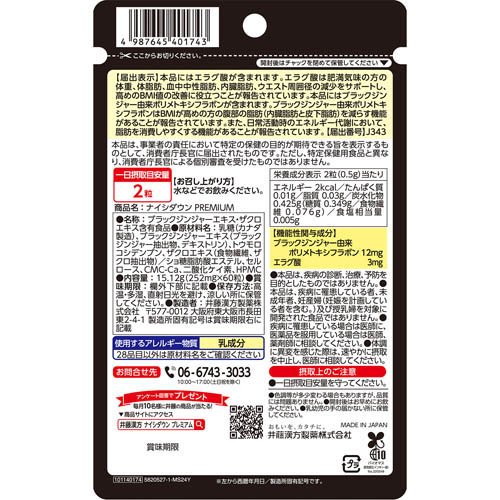 お店TOP>健康食品>ダイエットサポート>ダイエットサプリメント>ダイエットサポートサプリ>ナイシダウンPREMIUM 30日分 (60粒入×4セット(1粒252mg))商品区分:機能性表示食品(J343)【ナイシダウンPREMIUM 30日分の商品詳細】●本品は2つの機能性関与成分ブラックジンジャー由来ポリメトキシフラボンとエラグ酸を配合したプレミアムな商品です。●貴方の「何とかしたいっ」をサポートします!【保健機能食品表示】届出表示:・本品にはエラグ酸が含まれます。・エラグ酸は肥満気味の方の体重、体脂肪、血中中性脂肪、内臓脂肪、ウエスト周囲径の減少をサポートし、高めのBMI値の改善に役立つことが報告されています。・本品にはブラックジンジャー由来ポリメトキシフラボンが含まれます。・ブラックジンジャー由来ポリメトキシフラボンはBMIが高めの方の腹部の脂肪(内臓脂肪と皮下脂肪)を減らす機能があることが報告されています。・また、日常活動時のエネルギー代謝において、脂肪を消費しやすくする機能があることが報告されています。【1日あたりの摂取目安量】2粒【召し上がり方】水などでお飲みください。【品名・名称】ブラックジンジャーエキス・ザクロエキス含有食品【ナイシダウンPREMIUM 30日分の原材料】乳糖(カナダ製造)、ブラックジンジャーエキス(ブラックジンジャー抽出物、デキストリン)、トウモロコシデンプン、ザクロエキス(食物繊維、ザクロ抽出物)/ショ糖脂肪酸エステル、セルロース、CMC-Ca、二酸化ケイ素、HPMC【栄養成分】2粒(0.5g)当たりエネルギー:2kcal、たんぱく質:0.01g、脂質:0.03g、炭水化物:0.425g(糖質:0.349g、食物繊維:0.076g)、食塩相当量:0.005g「機能性関与成分」ブラックジンジャー由来ポリメトキシフラボン:12mg、エラグ酸:3mg【アレルギー物質】乳成分28品目以外は原材料名をご確認ください。【規格概要】15.12g(252mg×60粒)【保存方法】高温・多湿、直射日光を避け、涼しい所に保管してください。【注意事項】・本品は、事業者の責任において特定の保健の目的が期待できる旨を表示するものとして、消費者庁長官に届出されたものです。ただし、特定保健用食品と異なり、消費者庁長官による個別審査を受けたものではありません。・本品は、疾病の診断、治療、予防を目的としたものではありません。・本品は、疾病に罹患している者、未成年者、妊産婦(妊娠を計画している者を含む。)及び授乳婦を対象に開発された食品ではありません。・疾病に罹患している場合は医師に、医薬品を服用している場合は医師、薬剤師に相談してください。・体調に異変を感じた際は、速やかに摂取を中止し、医師に相談してください。・食生活は、主食、主菜、副菜を基本に、食事のバランスを。★摂取上のご注意・一日摂取目安量を守ってください。・色調等が多少変わる場合もありますが、品質には問題ありません。・開封後はお早めにお飲みください。・乳幼児の手の届かない所に保管してください。【原産国】日本【発売元、製造元、輸入元又は販売元】井藤漢方製薬※説明文は単品の内容です。リニューアルに伴い、パッケージ・内容等予告なく変更する場合がございます。予めご了承ください。・単品JAN:4987645401743井藤漢方製薬577-0012 大阪府東大阪市長田東2-4-106-6743-3033広告文責:楽天グループ株式会社電話:050-5577-5042[ダイエットサプリメント]