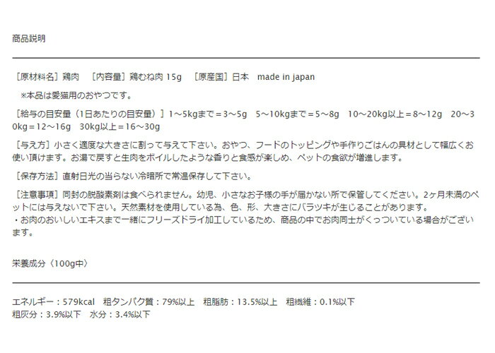 保存方法 ・同封の脱酸素剤は食べられません。・幼児、小さなお子様の手が届かない所で保管してください。・2ヶ月未満のペットには与えないで下さい。・天然素材を使用している為、色、形、大きさにバラツキが生じることがあります。・直射日光の当らない冷暗所で常温保存して下さい。 原材料 鶏肉栄養成分(100g中)エネルギー:579kcal 粗タンパク質:79%以上 粗脂肪:13.5%以上 粗繊維:0.1%以下 粗灰分:3.9%以下 水分:3.4%以下 生産国・加工国 日本 内容量 15g サイズ 80×205×25 商品区分 ペット用品 製造元 ホワイトフォックス 検索用文言 [ホワイトフォックス]whitefox 鶏むね肉のフリーズドライ プチサイズ 約15g (ペットフード) 広告文責 株式会社ケンコーエクスプレス TEL:03-6411-5513新鮮な長州どりのむね肉をそのままフリーズドライ。おやつやトッピング、手作りごはんの具材として 新鮮で安心・安全な鶏肉をそのままフリーズドライ。 素材と鮮度にこだわり抜いているから、美味しさも格別! フリーズドライがあれば何時でも簡単に「愛情たっぷりごはん」。
