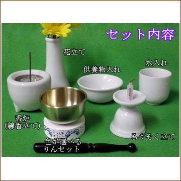 ペット仏壇や納骨堂にもすっきり置けるコンパクトサイズ。長く使える定番の白色でとても人気のペット用仏具りん付6点セットです。「天使とお星さまのおりん」は、ペット供養専用にデザインされたとても可愛いコンパクトなおりんです。ホワイトレザー調の台座には「天使の羽」と「お星さま」が鳴らす度にあの子を癒やしてくれているようです。【サイズ一覧】ご購入前にサイズのご確認をお願い致します。・りんセット 高さ 5cm 直径(最大) 6cm・花立 高さ 9.3cm 直径(最大) 5cm・水入れ 高さ 5cm 直径(最大) 4.5cm・ろうそく立て 高さ 5.2cm(針部分除く) 直径(最大) 4.3cm・香炉 高さ 5.2cm 直径(最大) 6.7cm・お供え皿 高さ 3.3cm 直径(最大)7.2cm【素材】・仏具 陶器・りん 真鍮・台座(りん) 圧縮ボードペーパー 合皮材・りん棒 黒檀