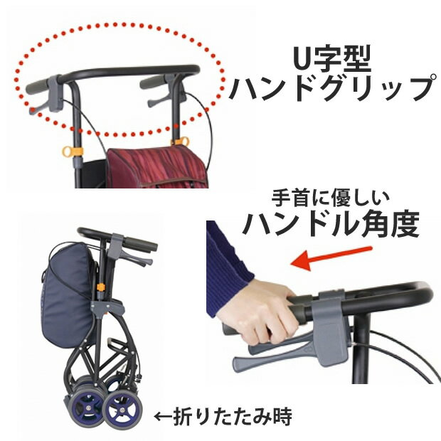 ※レッドのお色は販売を終了いたしました。 NEW! あると便利なコンパクト車いすの新商品U字型ハンドル採用で、手首が痛くなりにくいように角度で設計した新構造。手首に優しく押しやすいU字型ハンドルのシルバーカー・U字型ハンドルグリップ採用U字型ハンドルで、体の近くでグリップを握りやすく、ラクな姿勢で歩行できる。・手首にやさしいハンドル角度と高さ。ハンドルグリップは手首の負担軽減のため少し傾斜し、押しやすい高さに設定!アルミ塗装仕上げ最大積載荷重:5kg<材質>本体:アルミニウム合金(一部スチール)座面:ナイロン・ポリエステル袋:ポリエステルパイピング:ポリエチレンタイヤ:EVA・ポリプロピレン仕様表詳細認定マーク:SGマーク 組立寸法:幅425×奥行590×高さ840〜930mm押し手高さ:800〜890mm(5ポジション)折りたたみ寸法:幅425×奥行410×高さ730mm座面寸法:幅330×奥行200×座面高さ445mm袋サイズ:幅230×奥210×高さ380mm前輪サイズ:150mm後輪サイズ:150mm重量:約4.6kgバッグ容量:約16リットル最大使用者体重:80kg規格1台 ケンクル(kenkul)では他にも多くのシルバーカーをご用意しています 軽量で持ち運びに便利お散歩にも最適大きめの袋やかごが付いてお買い物に便利幅が広めでしっかりとした安定感がある体重を支えながら移動できる