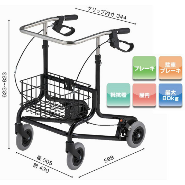法人様宛送料無料キャンペーンお届け先のお名前かお届け先のご住所に法人様のお名前が入っている場合は送料無料となります。お届け先が法人様の場合でも、法人様のお名前が入力されていない場合には送料無料対象外となりますのでご注意ください。※ご注文時は送料が加算されておりますが、弊社にてご注文確認後に送料無料に訂正させて頂きます。※北海道・沖縄・離島は法人様宛の場合でも別途送料が追加になります。 NEW! あると便利なコンパクト車いすの新商品■収納に便利なかご付き歩行車(かご耐荷重 5kg)コンパクトサイズで狭い環境でも使用可能です[ブレーキ]・ブレーキ付きの製品です。・レバーを握る事でブレーキをかける事ができます。[駐車ブレーキ]・駐車ブレーキ機能付きの製品です。駐車ブレーキをかける時は、ブレーキレバーを握りレバーの下にあるピンを押しこみレバーをロックします。[抵抗器]・抵抗器付きの製品です。・ご利用者様の身体の状態に合わせて歩行速度の調整ができます。[屋内]・屋内向けの製品です。<材質>本体:スチール製仕様表詳細高さ:623〜823mm(ピン式 40mmピッチ 6段階)幅:前430mm/後505mm奥行:598mm重量:9.5kgグリップ内寸:344mmキャスター:150Φ 前輪自在/後輪固定カゴサイズ:320×230×160mm最大使用者体重:80kg規格1台 ケンクル(kenkul)では他にも多くのシルバーカーをご用意しています 軽量で持ち運びに便利お散歩にも最適大きめの袋やかごが付いてお買い物に便利幅が広めでしっかりとした安定感がある体重を支えながら移動できる