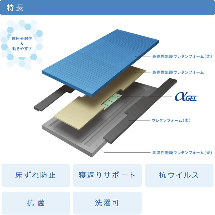 業界初!!「抗ウイルス」「抗菌」Wのチカラであなたを守りたい。医療・介護用マットレス初「抗ウィルス」「抗菌」のW加工カバー仕様○アルファプラF2×エアロテクノ(AEROTECHNO)「エアロテクノ™」とは、小松マテーレ株式会社が開発した抗ウイルス加工素材です。※本製品は全てのウイルス、菌による感染を予防するものではありません。○低体重の方から高体重の方まで従来難しいとされていた体重の軽い方から重い方まで、オールマイティに対応できるマットレスを実現。体重の軽い方でも十分に身体が沈み込み、高い体圧分散効果。○寝返りがしやすい特殊構造硬さや弾力の異なる素材を組み合わせた特殊構造により、寝返り時に必要な下肢の回転がしやすくなっています。○熱がこもりにくくムレにくい 丸洗いOK 耐久性に優れへたりに強い空気や水を通しやすい無膜ウレタンを採用することにより、暑さによるムレを軽減し、マットレス洗浄後の乾燥時間を有膜ウレタンの1/6に短縮しました。無膜ウレタンは耐久性に優れており、へたりに対しても強くなっています。○通気カバータイプ(カラー:表 / 青・裏 / こげ茶)吸湿速乾性で、いつでもさらっと快適です。○体圧分散式マットレス・床ずれ防止マットレス・床ずれ防止・寝返りサポート・洗濯可<材質>○中身:ポリウレタンフォーム、シリコーンゲル○カバー:ポリエステル仕様表詳細サイズ:幅91×長195×厚13cm/重量:9.0kgサイズ:幅83×長195×厚13cm/重量:8.3kgサイズ:幅91×長181×厚13cm/重量:8.5kgサイズ:幅83×長181×厚13cm/重量:7.8kg規格1枚