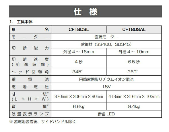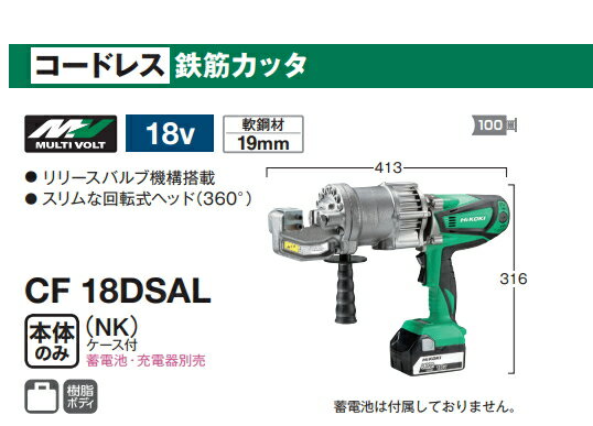 品名 コード No. カッタブロック(2個入) 339450 油圧オイル(70cc) 306295 ・HiKOKI 18V 充電式鉄筋カッター CF18DSAL(NK)(本体+ケース付) 標準付属品:サイドハンドル、ケース、六角棒スパナ(4・5mm)、油圧オイル 【バッテリー・充電器別売】 ・リリースバルブ機構搭載 何らかの原因で噛み込んだピストンを、バルブを緩めて油圧を解除することで、元の位置に戻すことができます。 ・スリムな回転式ヘッド 本機を地面に置いて切断する場合でも、手に持って切断する場合でも、ヘッドの向きを自在に変えられるので、状況に合わせた向きで使用できます。 ・鉄筋の飛散を防止するガード 強度の高い材料や、材料を短く切断してしまった場合などに起こりやすい、切断片の飛び跳ねから使用者を守るガードを標準付属しています。