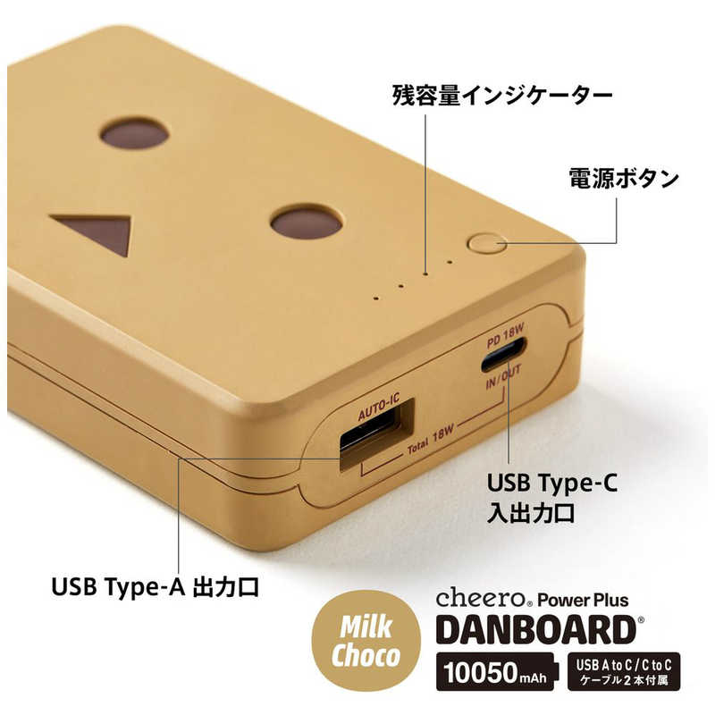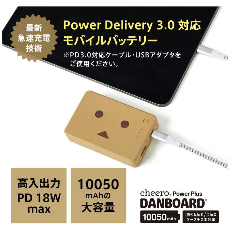 CHEERO cheero ダンボーバッテリー 10050mAh PD18W ブラウン CHE-096-BR 新品未開封 USB-AとUSB-Cの2ポートで、2台同時充電可能。(合計18W)カラーはミルクチョコ・バブルブルー・メロンソーダ・ストロベリー・バナナシェイクの全5種類! 可愛くてポップなカラー展開となっております。■最新急速充電規格 Power Delivery 3.0 対応 PD対応USBアダプタを使用した場合、バッテリー本体は約2時間半でフルチャージ。超急速充電を実現しました! USB-CポートからPD対応機器への充電はiPhone XSなら45分間で0%から約75%まで充電可能です。■充実の付属品 USB-C差込口のアダプターを所有していない方でも本体充電できるよう、USB-CtoCケーブルの他にUSB-AtoCケーブルを付属しております。さらに可愛いオリジナルポーチ付き!ぜひ外出時に本バッテリーを入れてお使い下さい。 2