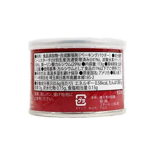 ■商品名:ベーキングパウダーラムフォード ■内容量:113g ■原材料:コーンスターチ、(分別生産流通管理済み)、炭酸水素ナトリウム、第一リン酸カルシウム ■原産国:アメリカ 時期によって変更することがございます。ご了承くださいませ。 ■賞味期限:製造日より2年 開封後賞味期限:開封後は密封し、なるべくお早めにお使い下さい。 ■商品詳細: 原材料は全て天然由来のものを使用。 アルミニウム不使用。 遮断剤のコーンスターチは非遺伝子組み替え品です。 生地の膨らむ作用が2度起こるダブルアクティング。 一度は水分が加わった時、さらに過熱時にもガスが発生しますので、よく膨らみます。