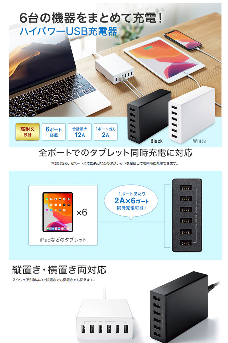 ●気になる商品■ 最大6台のスマートフォンやタブレットなどをまとめて充電できる、合計最大出力12Aに対応した高出力タイプのUSB充電器です。■ USB出力は1ポートあたり最大2Aまで対応しており、最大6台のUSB充電対応機器を同時に充電することができます。※ 本製品にはUSB充電用ケーブルは付属していません。ご使用になる機器に対応したUSB充電用ケーブルを別途ご用意ください。■ 日本メーカー製コンデンサを採用した約30000時間の高耐久設計により長寿命化を実現しています。※ 電気設計上の寿命であり、製品の寿命を保証するものではありません。※ 環境温度25℃で定格出力で使用した場合の寿命目安です。■ 横置き、縦置きどちらにも対応しています。[仕様情報]定格入力 : AC100V 50/60Hz定格出力DC5V/12A(6ポート合計最大)DC5V/2A (1ポート最大)プラグ形状 : 2Pポート数 : USB Aポートx6ポートサイズ : W106 x D32 x H78mm重量 : 240g(AC電源コード含まず)電源コード長 : 約1mm付属品 : AC電源コード[メーカー]サンワサプライ SANWA SUPPLY (SANWA)型番JANブラックACA-IP67BK4969887505458ホワイトACA-IP67W4969887505465[出力] 2.0A[対応] スマートフォン[性能] 6ポート[端子] USB A[色] ブラック[色] ホワイトSANWA USB充電器 USB A 6ポート